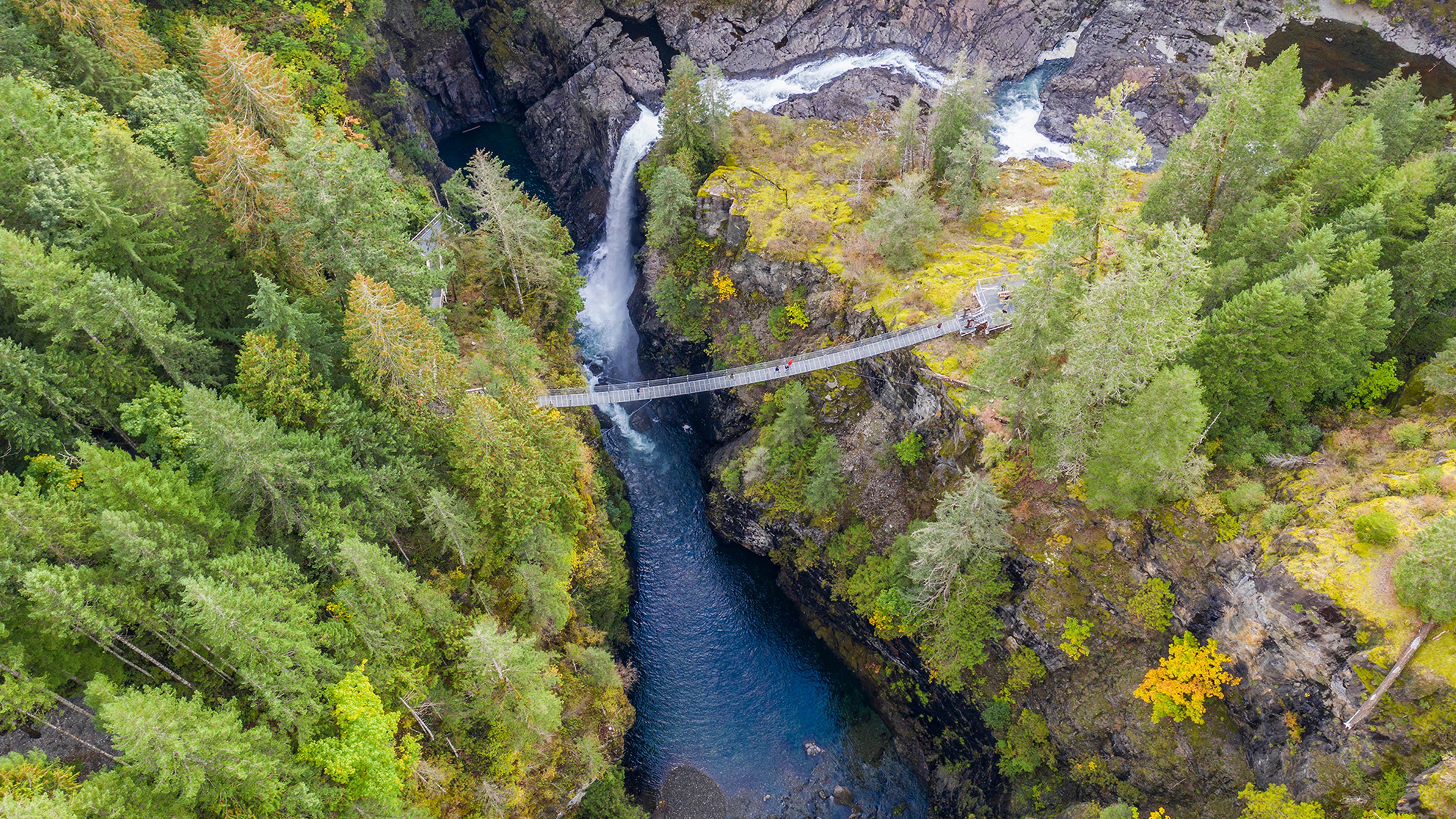 温哥华岛麋鹿瀑布吊桥鸟瞰图,加拿大
