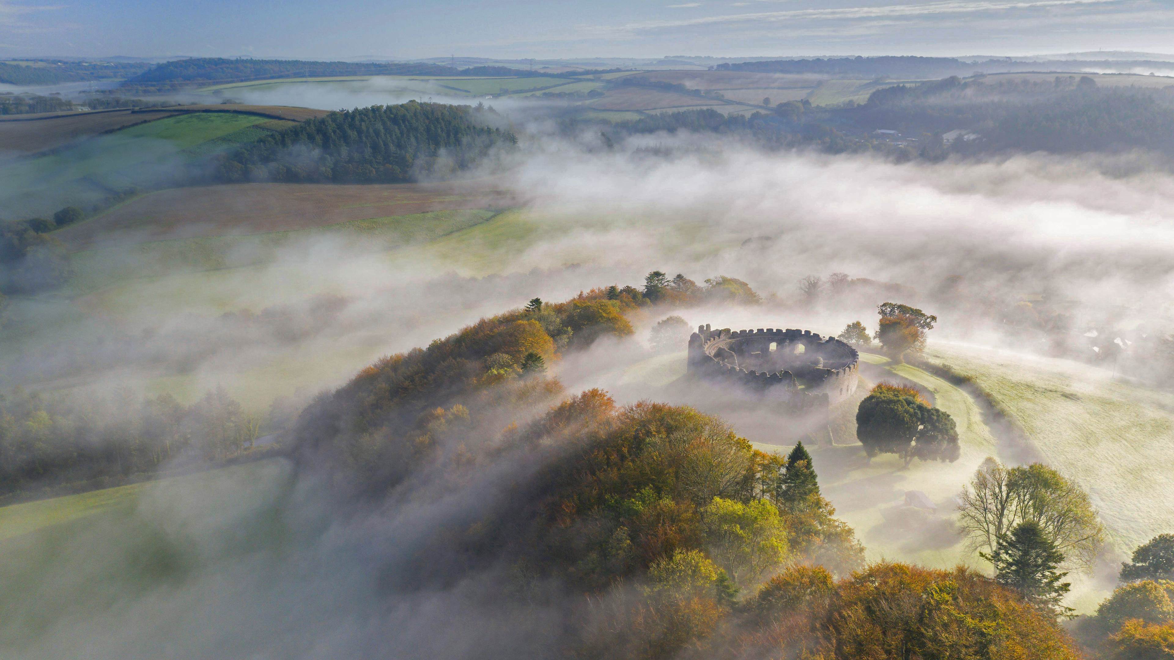 Restormel城堡上空的秋雾,英国康沃尔