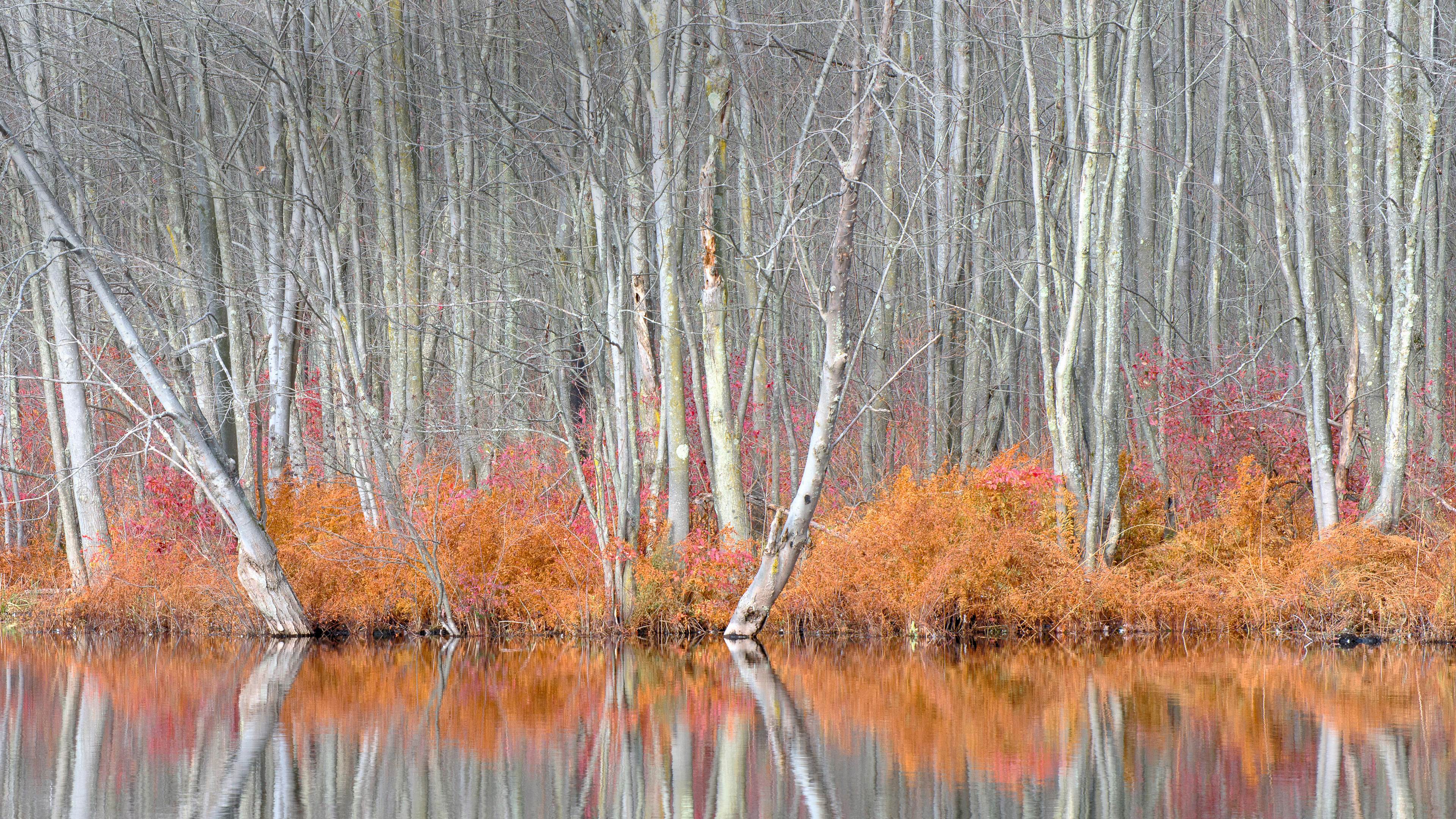 比弗湖自然中心内光秃秃的树和红盖鳞毛蕨,纽约