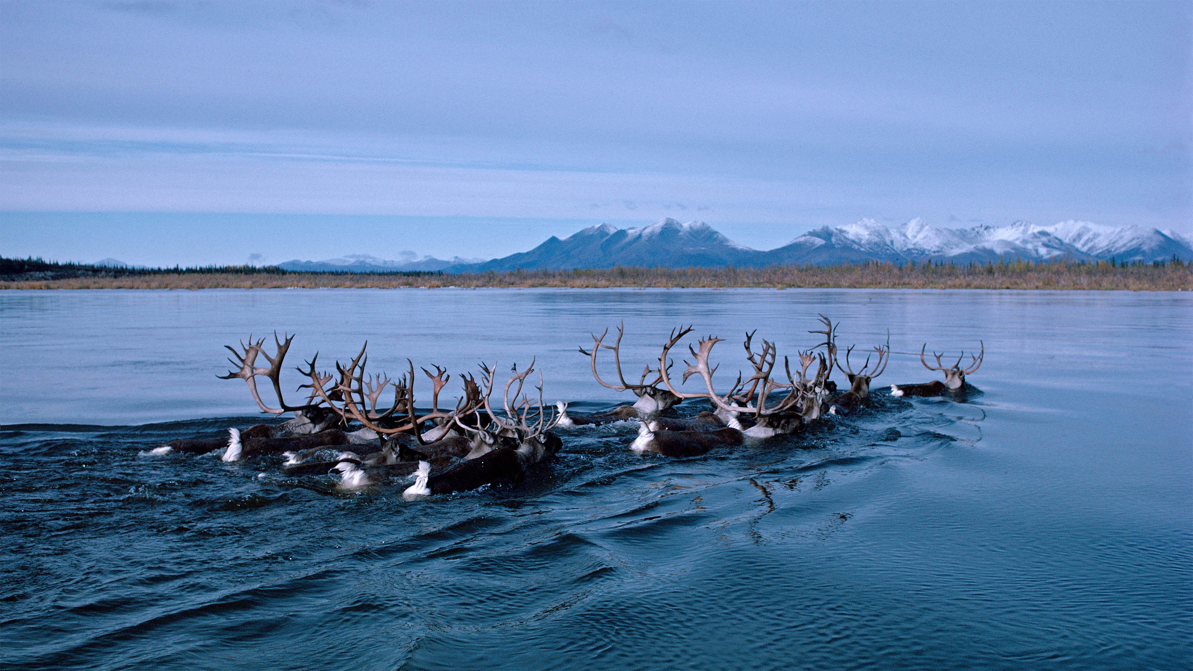 秋季迁徙时正在游过科伯克河的驯鹿,阿拉斯加