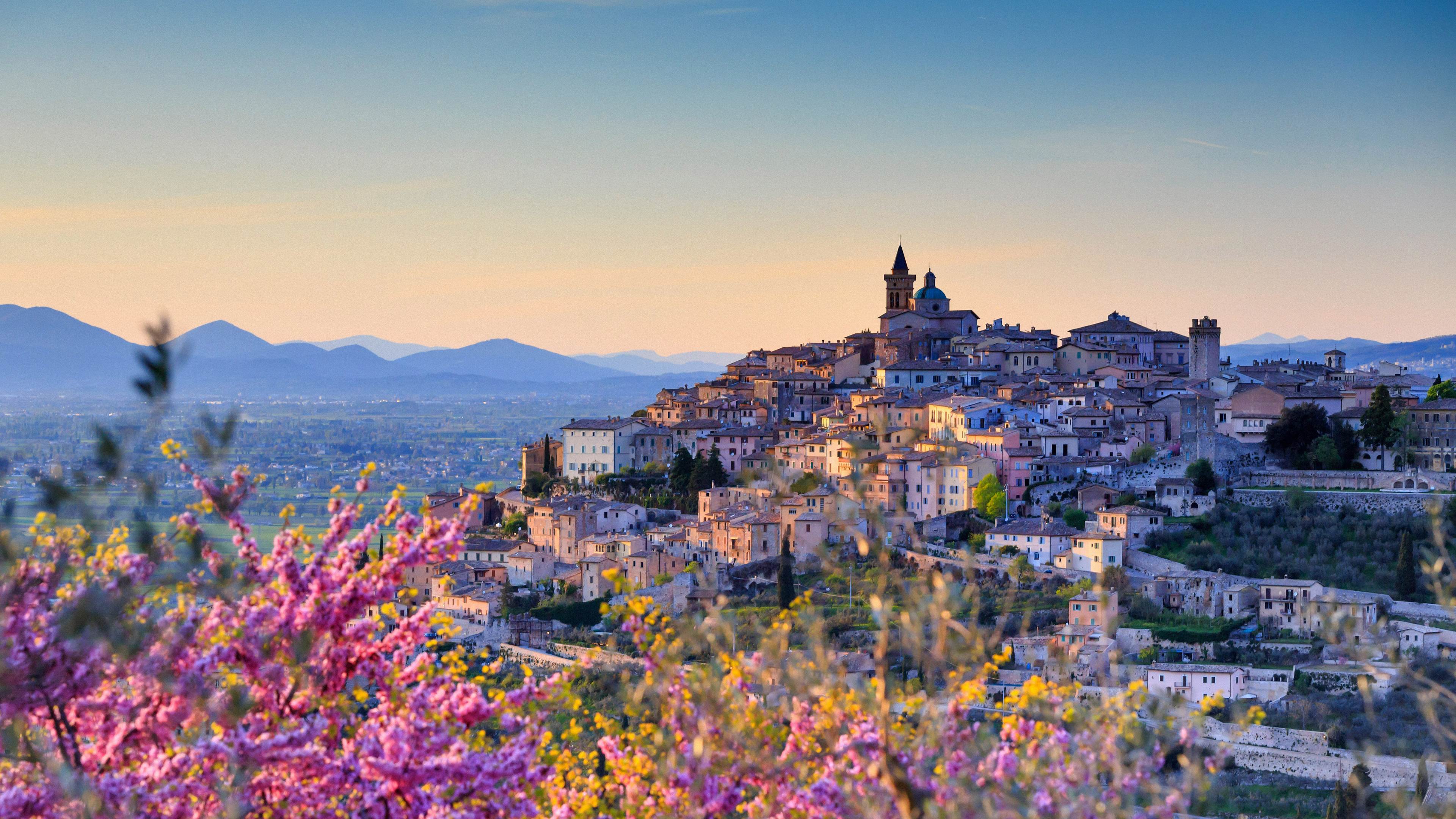 俯瞰着特雷维的扁桃花,意大利佩鲁贾
