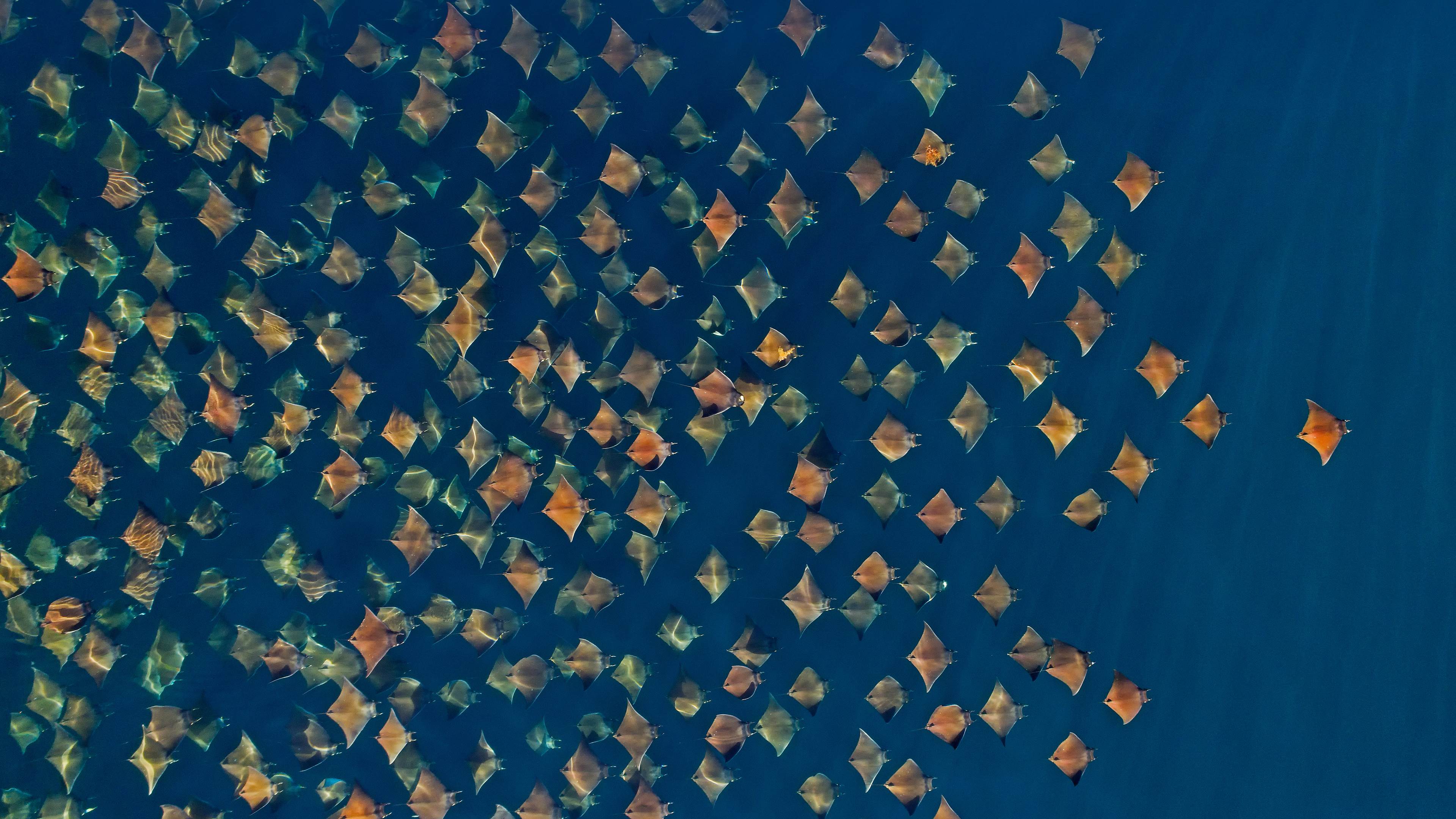 大群的芒基蝠鲼跃出水面,墨西哥加利福尼亚湾