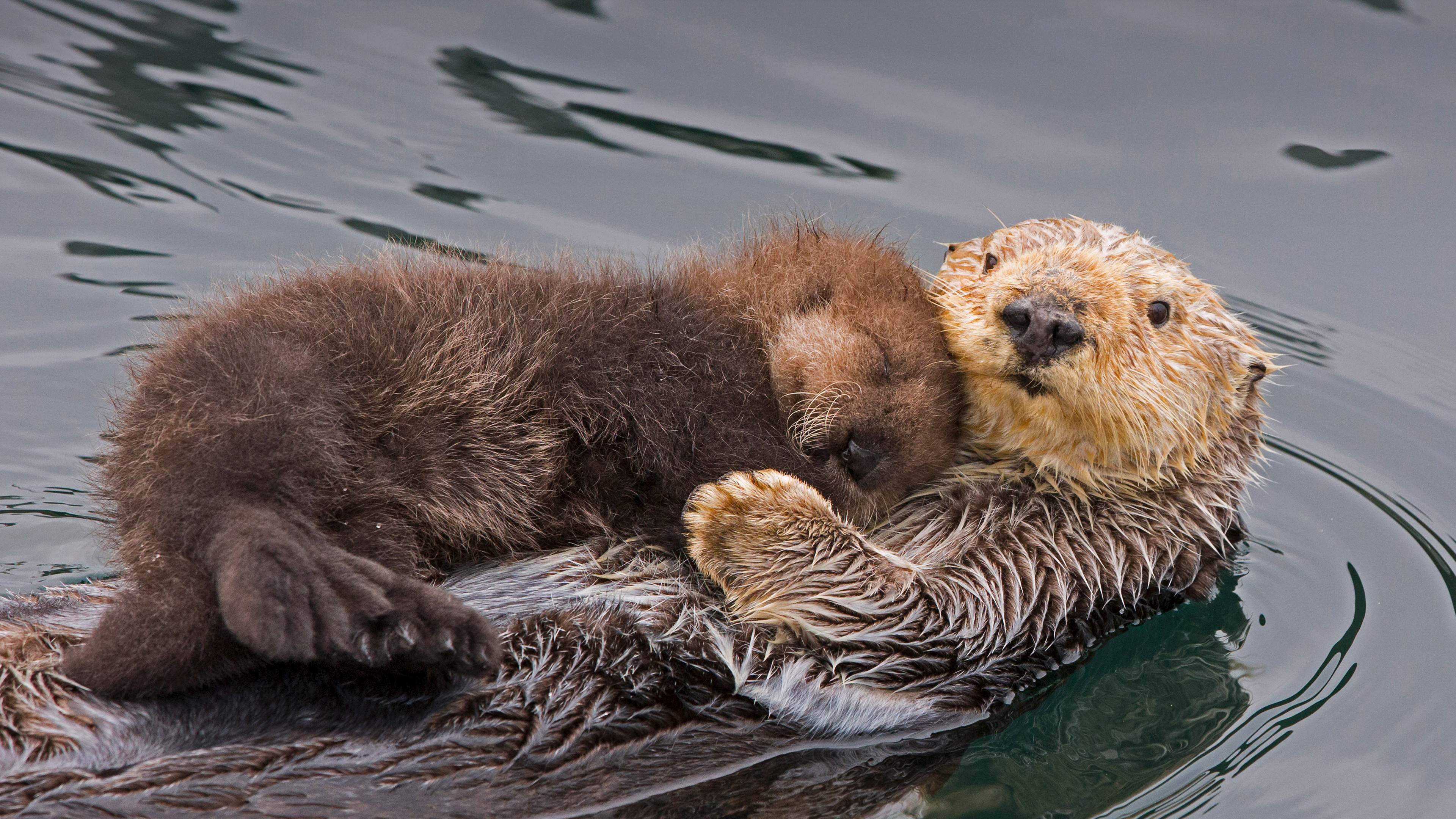 海獭妈妈和新生的幼崽,加利福尼亚州蒙特雷湾