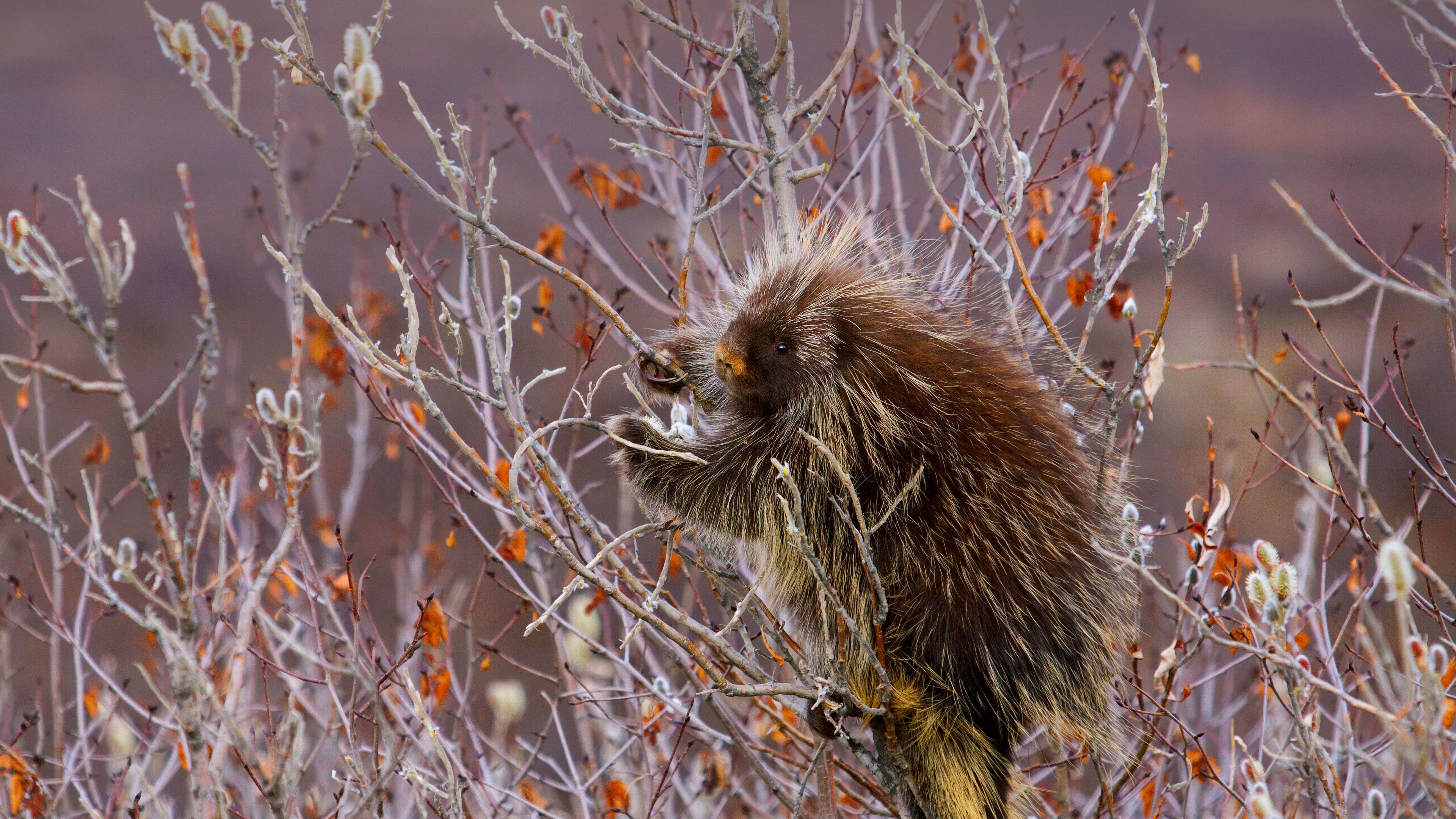 爬上柳树枝头的豪猪,美国阿拉斯加