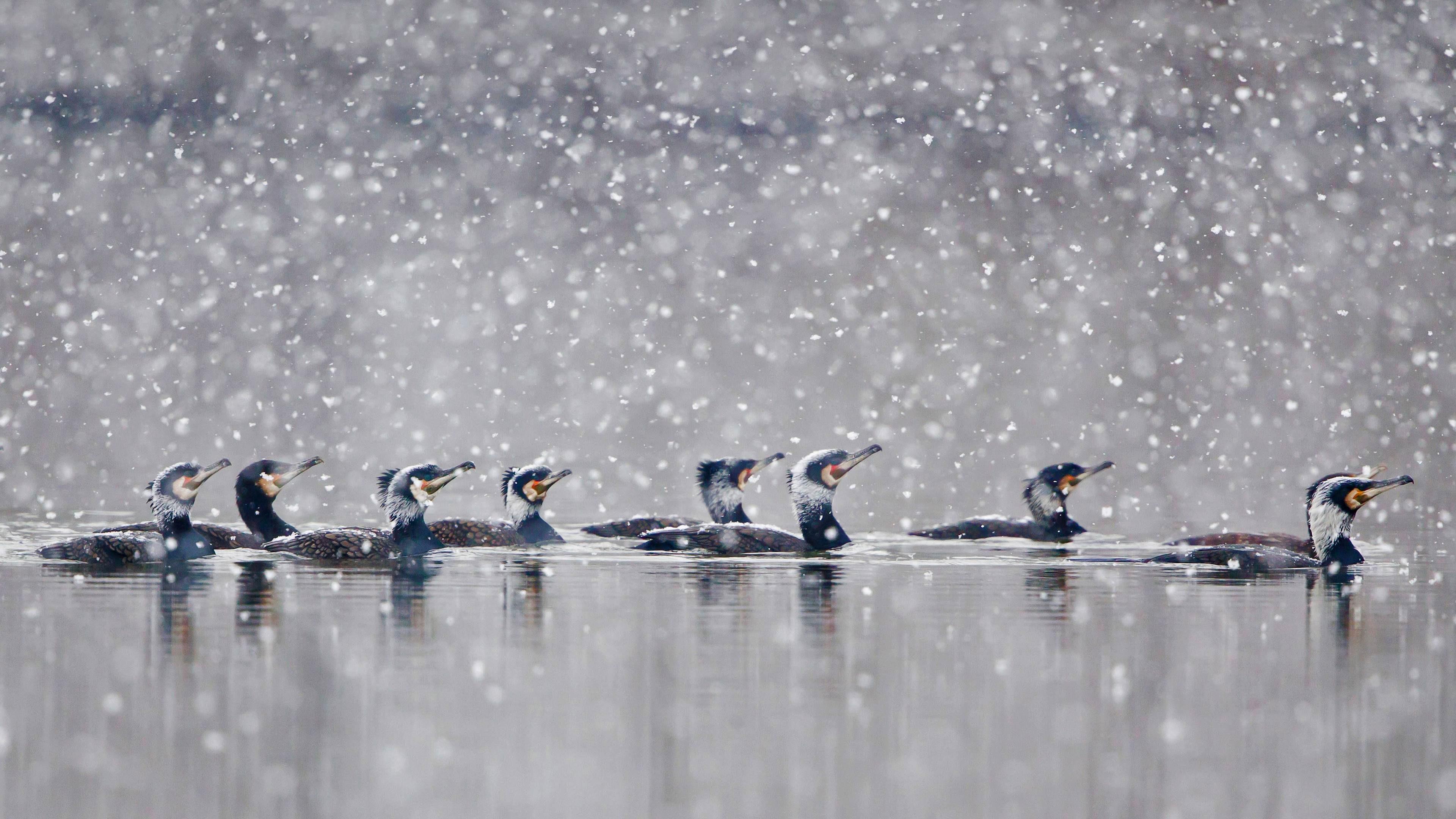 在暴风雪中畅游的鸬鹚,德国黑森州