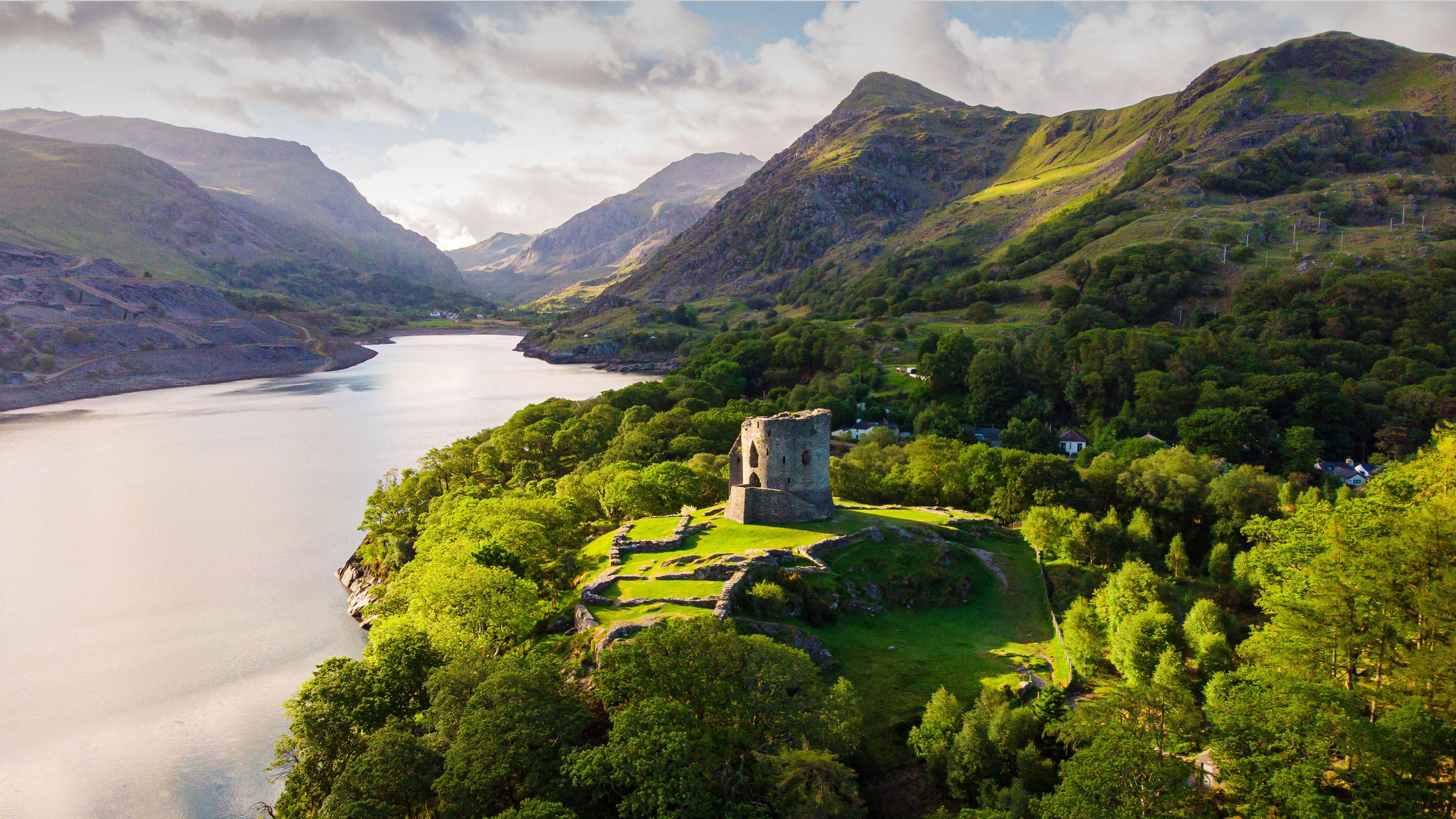 欢迎来到兰贝里斯山口,这里是穿过威尔士山脉的斯诺登山和吉德劳山的必经之地,也是双子湖(林恩·佩里斯湖和林恩·帕达恩湖)的所在地。矗立在湖边的是多尔巴达恩城堡的遗址。中世纪时,这座城堡曾是威尔士王子的据点,也是18世纪风景画家最喜欢的绘画对象。如今,它的外墙只剩下最底层的地基,但宏伟的50英尺(15.2米)高的圆形堡垒仍屹立不倒,成为了这个偏远山隘关口的唯一守护者。