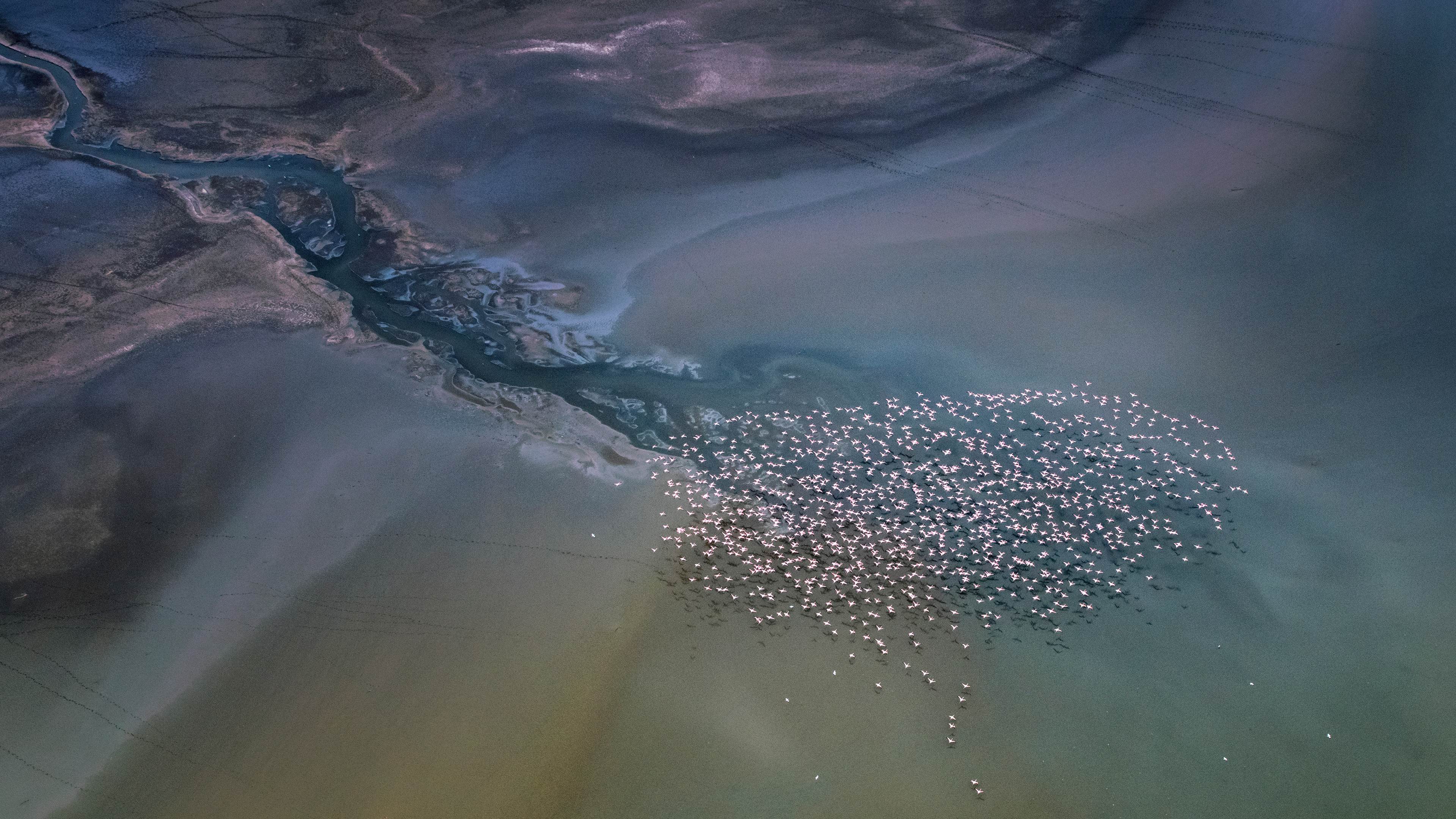 多么不可思议的景色啊!这张航拍照片展示了以肯尼亚马加迪湖为背景的小红鹳群。小红鹳是六种火烈鸟之一,以其鲜艳的粉红色羽毛和独特的觅食行为而闻名。由于喙的构造,这些鸟喜欢在水面附近进食。它们主要栖息在碳酸盐浓度较高的非洲苏打湖。马加迪湖就是这样一个充满蓝藻和海藻的苏打湖,为火烈鸟提供了充足的营养。成千上万只火烈鸟聚集在湖边的壮观景象揭示了这些独特生态系统的重要性。
