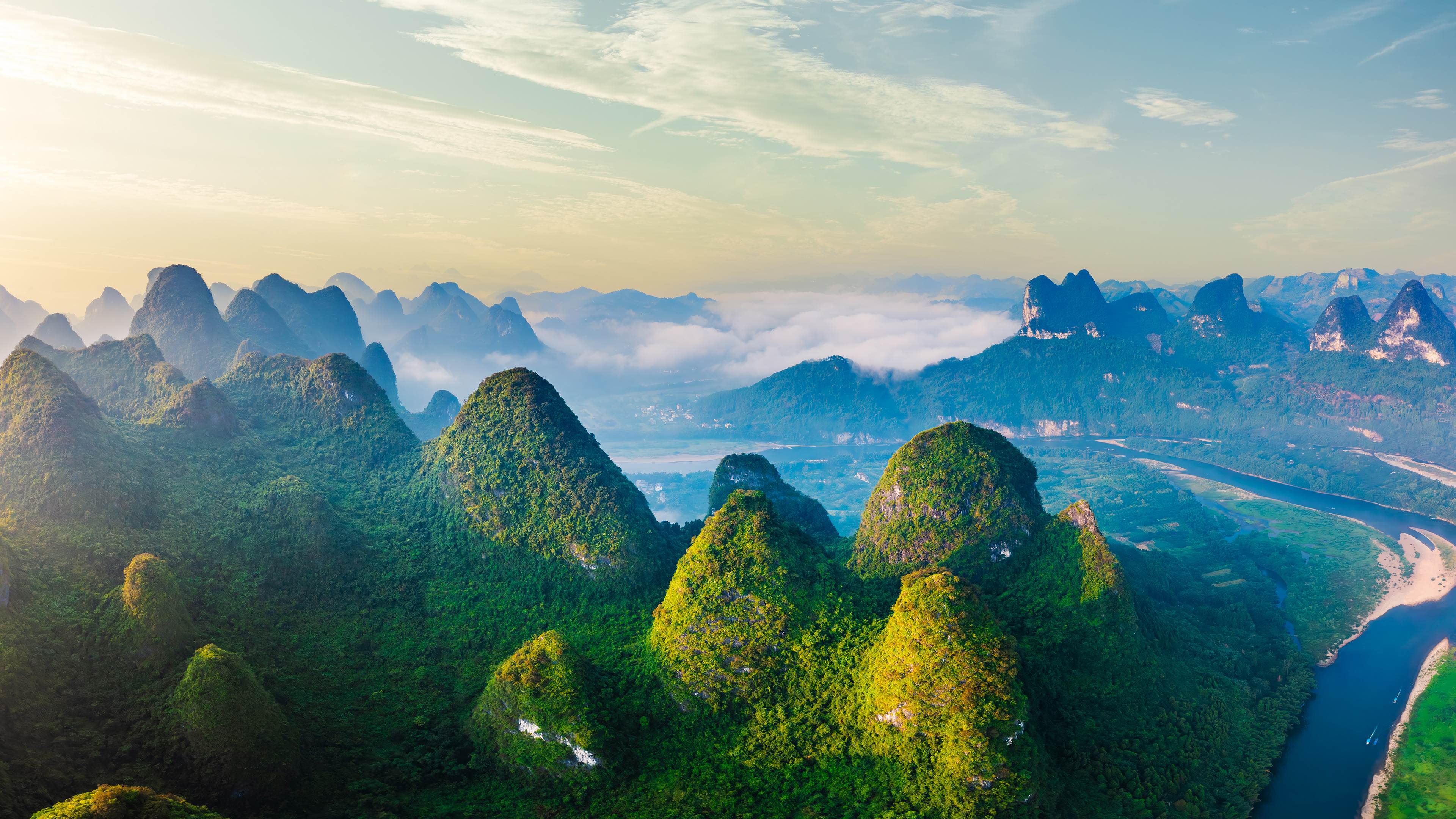 日出时分,美丽的喀斯特山脉鸟瞰图,中国桂林