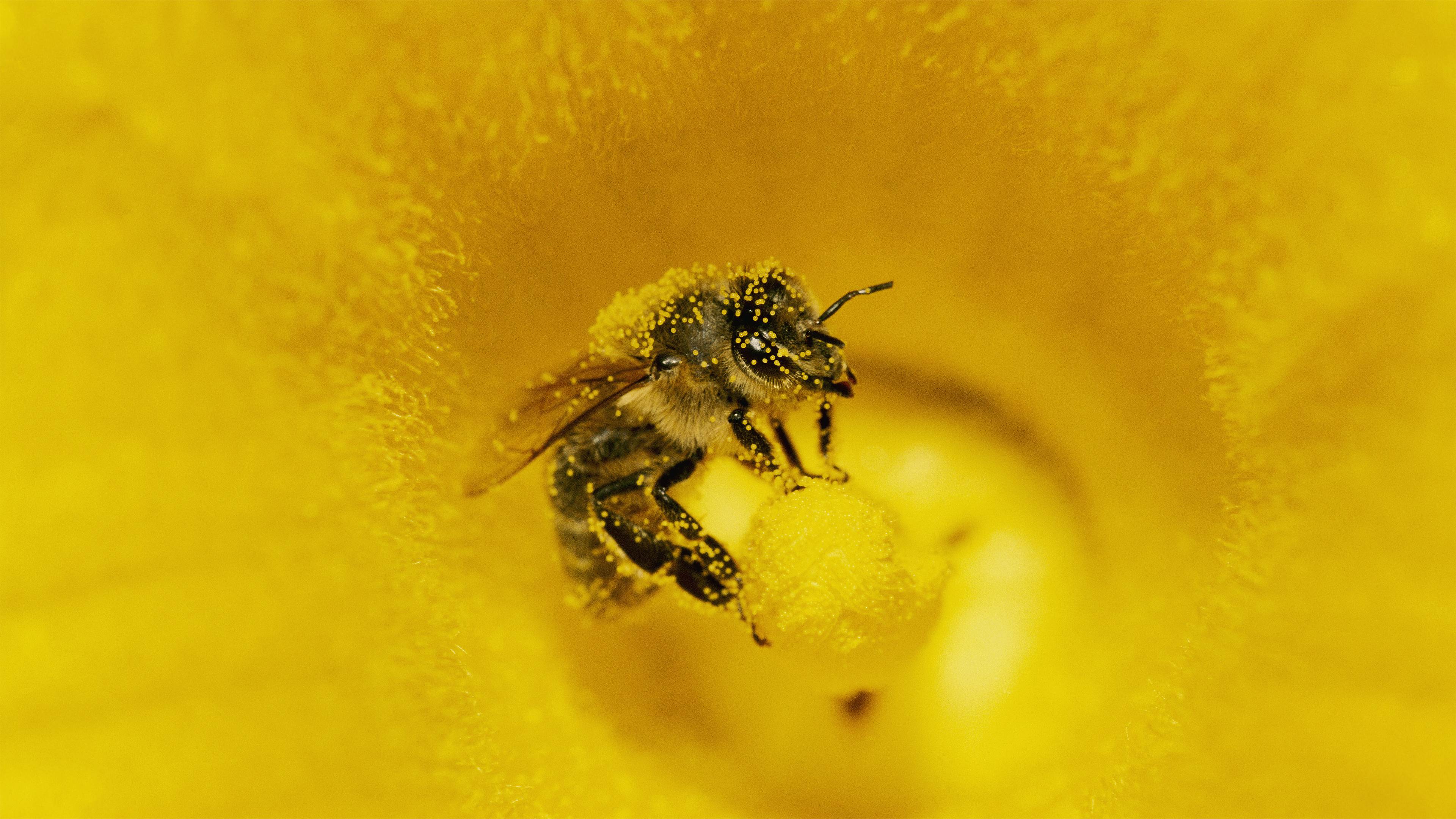 一只身上粘满南瓜花粉的蜜蜂,德国 (© Konrad Wothe/Minden Pictures)