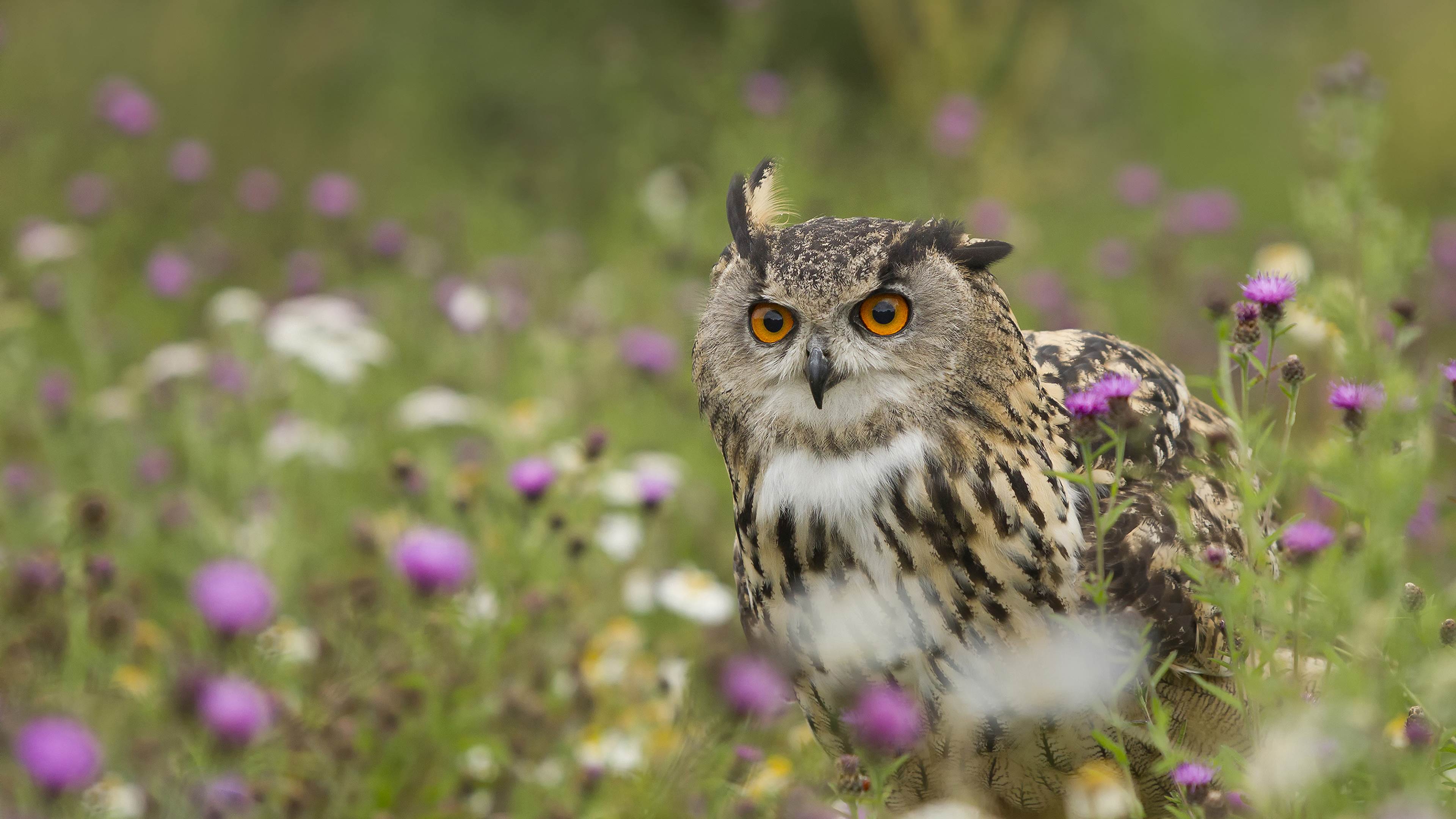 野花草甸上的一只欧亚雕鸮,德国莱茵兰-普法尔茨 (© Rosl Roessner/Minden Pictures)