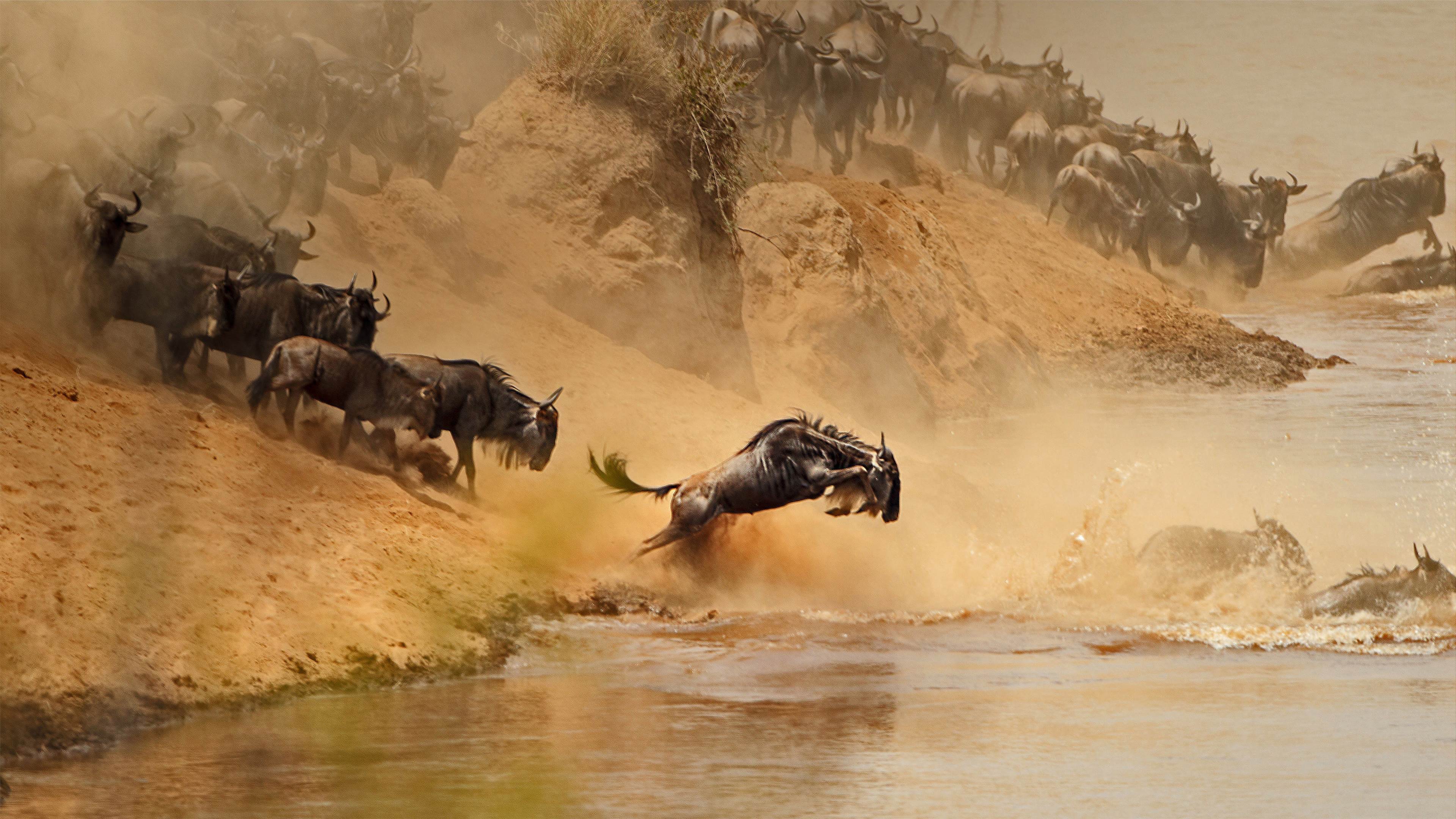 角马群穿越在肯尼亚和坦桑尼亚之间的马拉河 (© zhengvision/Getty Images)
