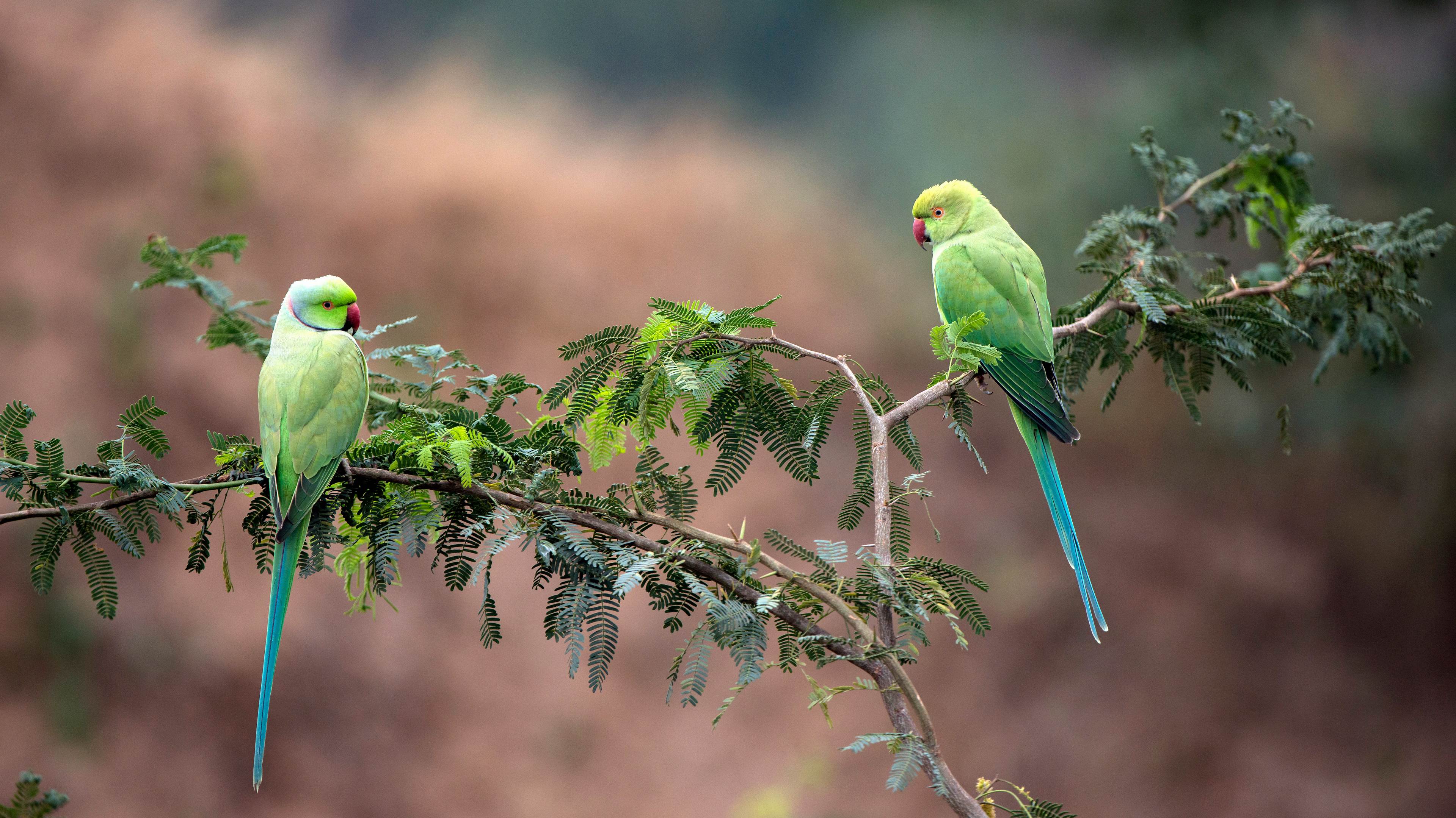 Gharial野生动物保护区中的两只玫瑰环鹦鹉,印度中央邦 (© Pete Oxford/Minden Pictures)