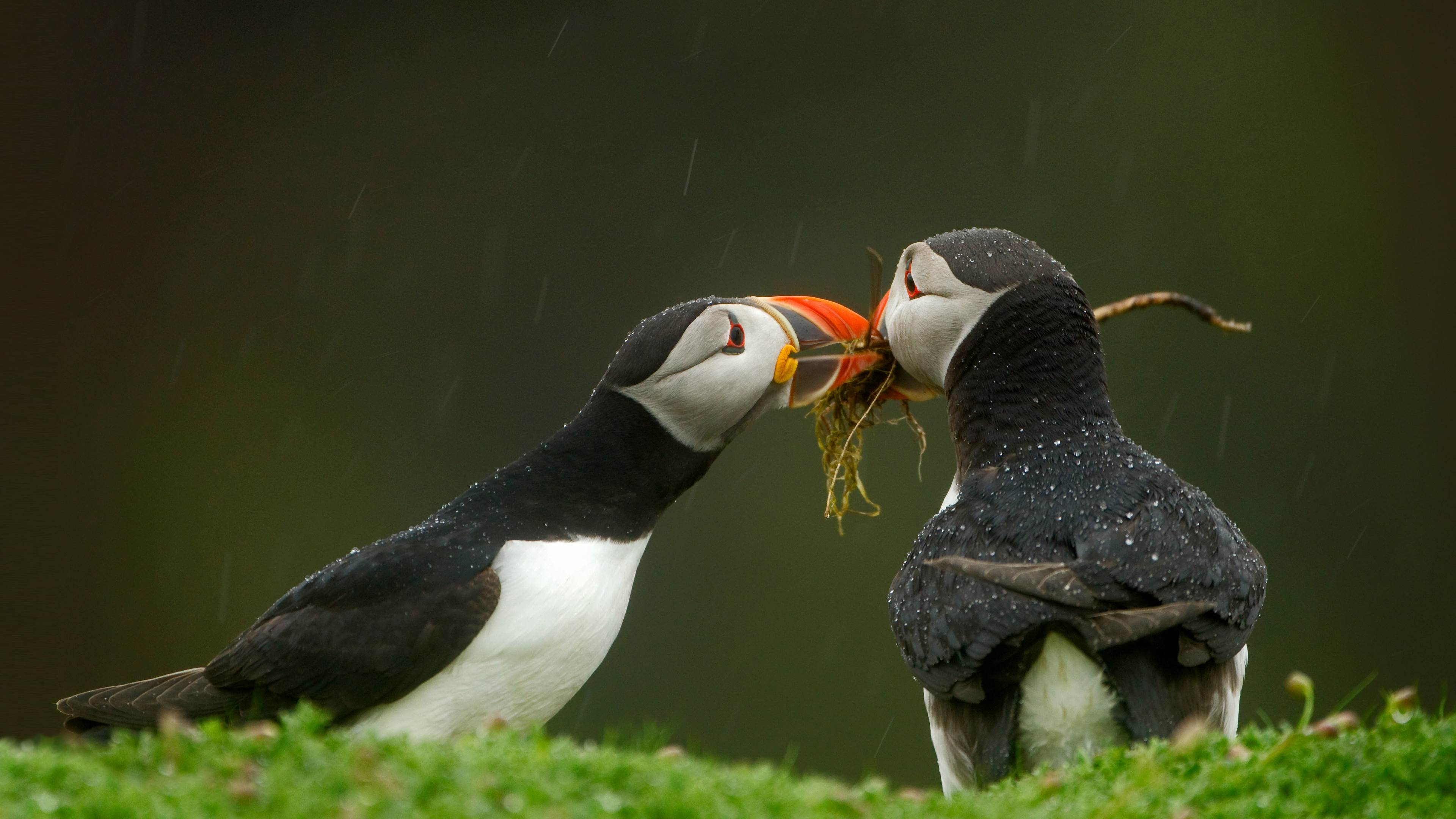 雄性大西洋海鹦将筑巢材料递给它的伴侣,威尔士斯科默岛 (© Danny Green/Minden Pictures)