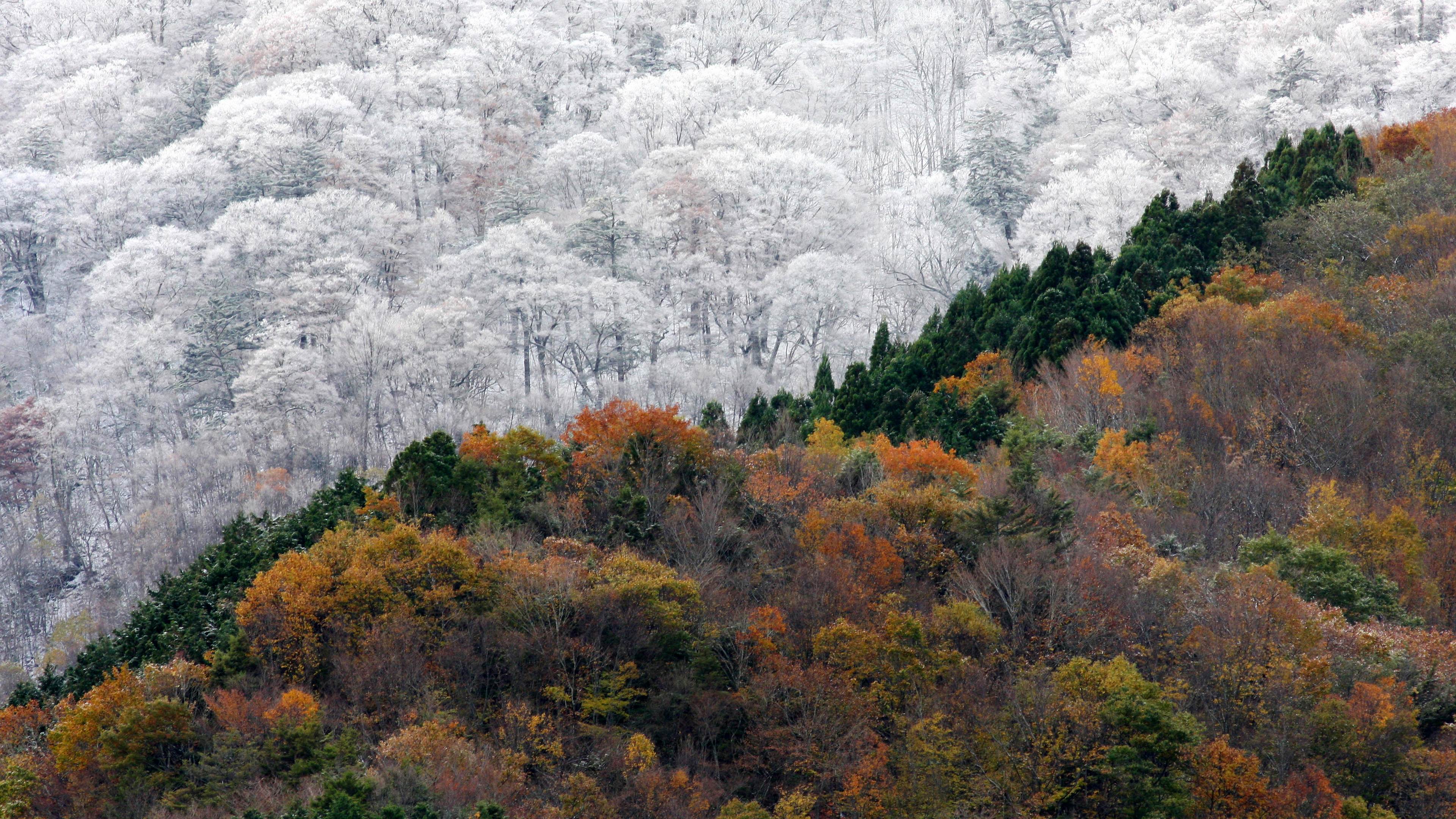 初雪与最后的秋色相会,日本 (© SpontaneousPictures/iStock/Getty Images Plus)