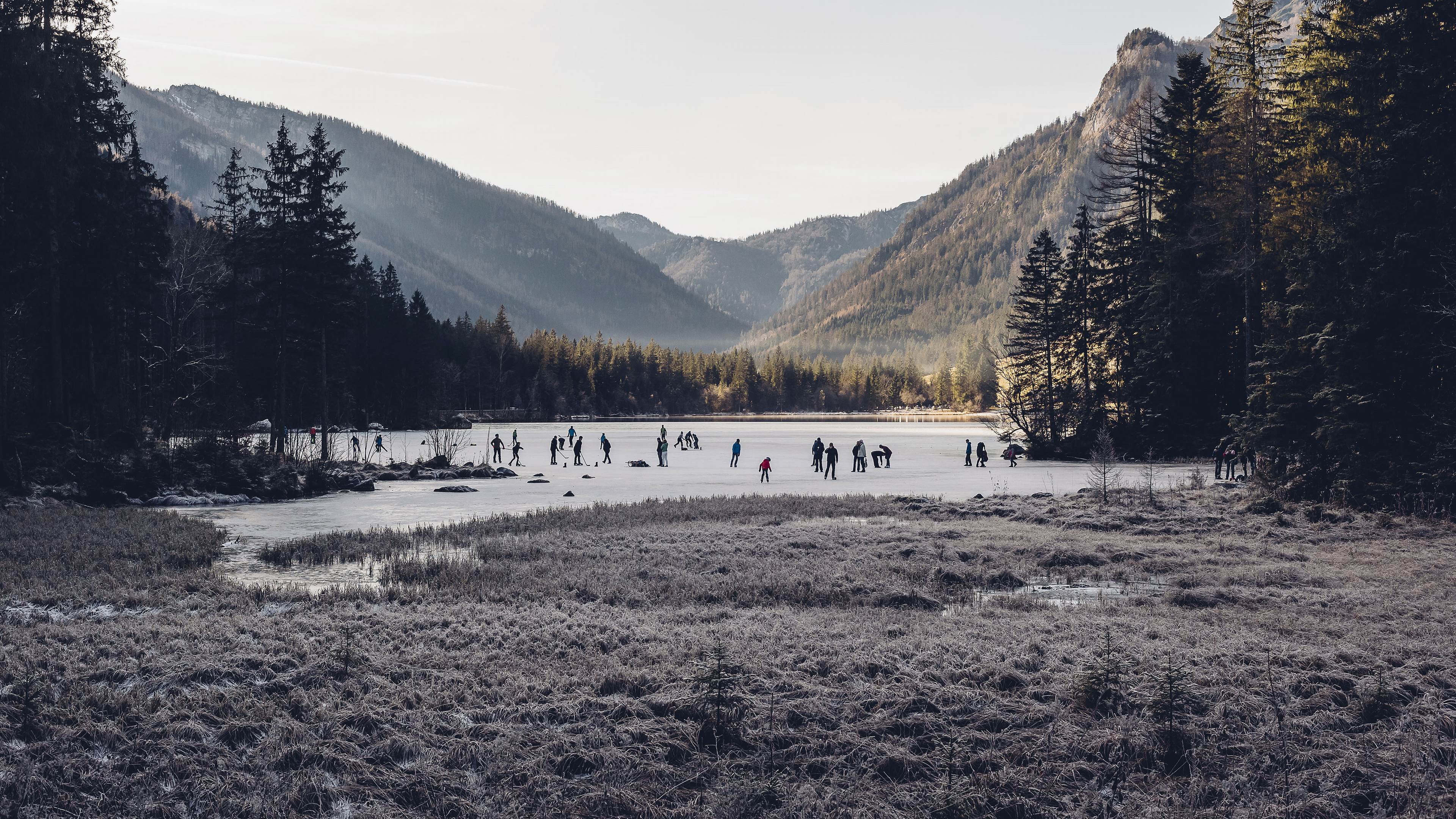 贝希特斯加登县拉姆绍小镇上结冰的Hintersee湖和滑冰者,德国巴伐利亚 (© Jana Mänz/Westend61/Offset)
