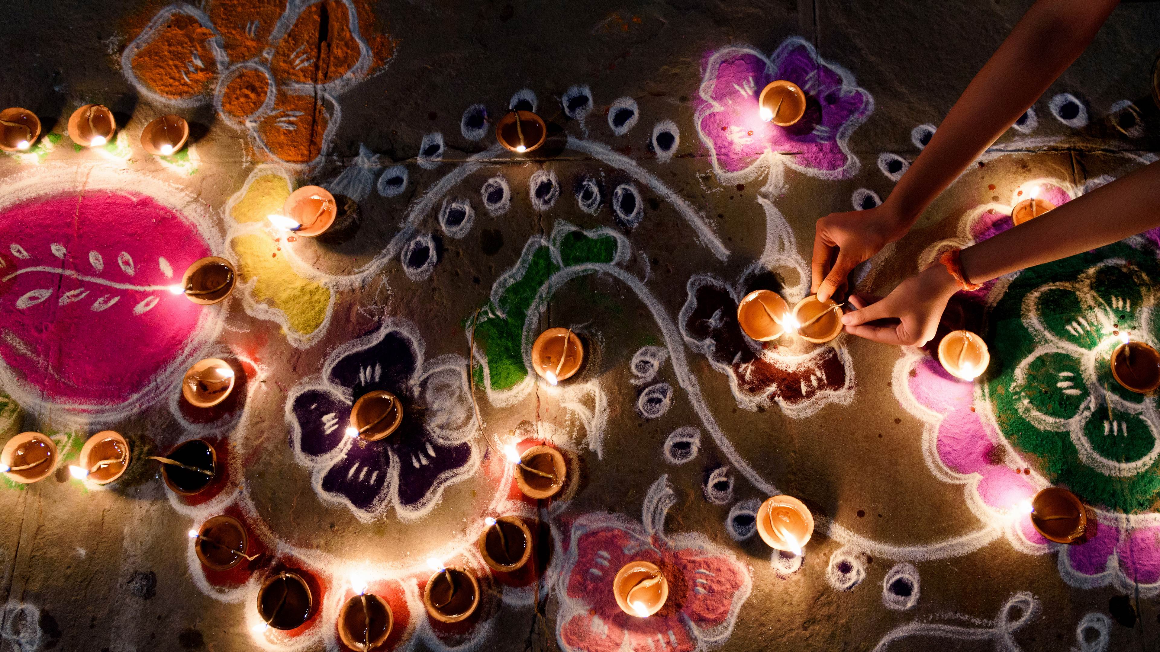 排灯节期间摆放在蓝果丽上的油灯 (© Subir Basak/Getty Images)