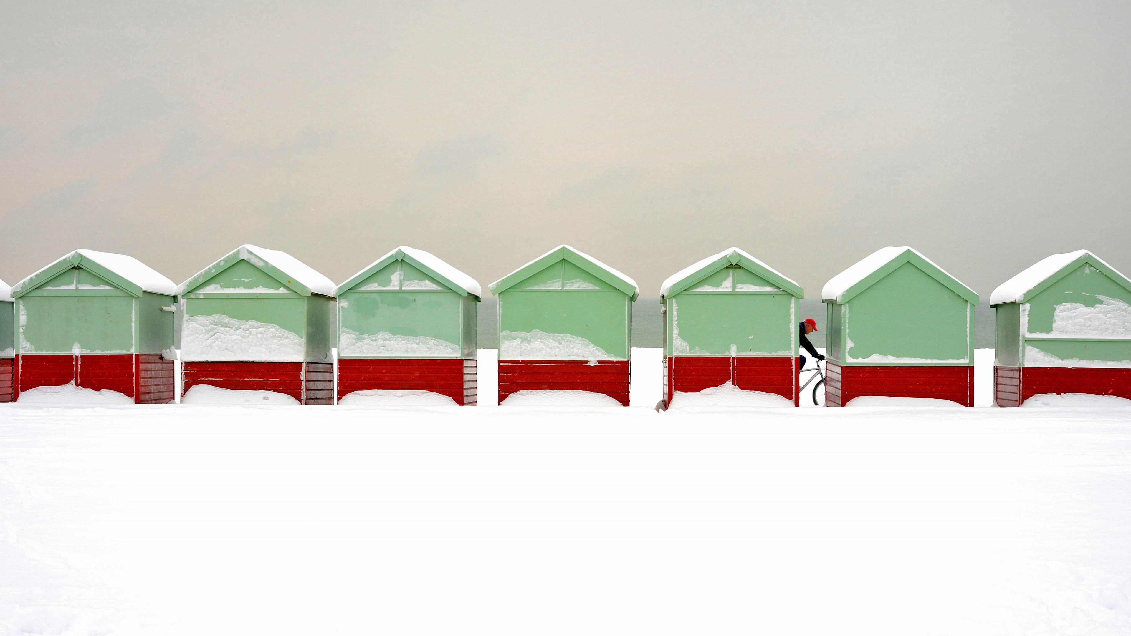 布莱顿-霍夫被雪覆盖的海滩小屋,英国 (© Tim Jones/Alamy)