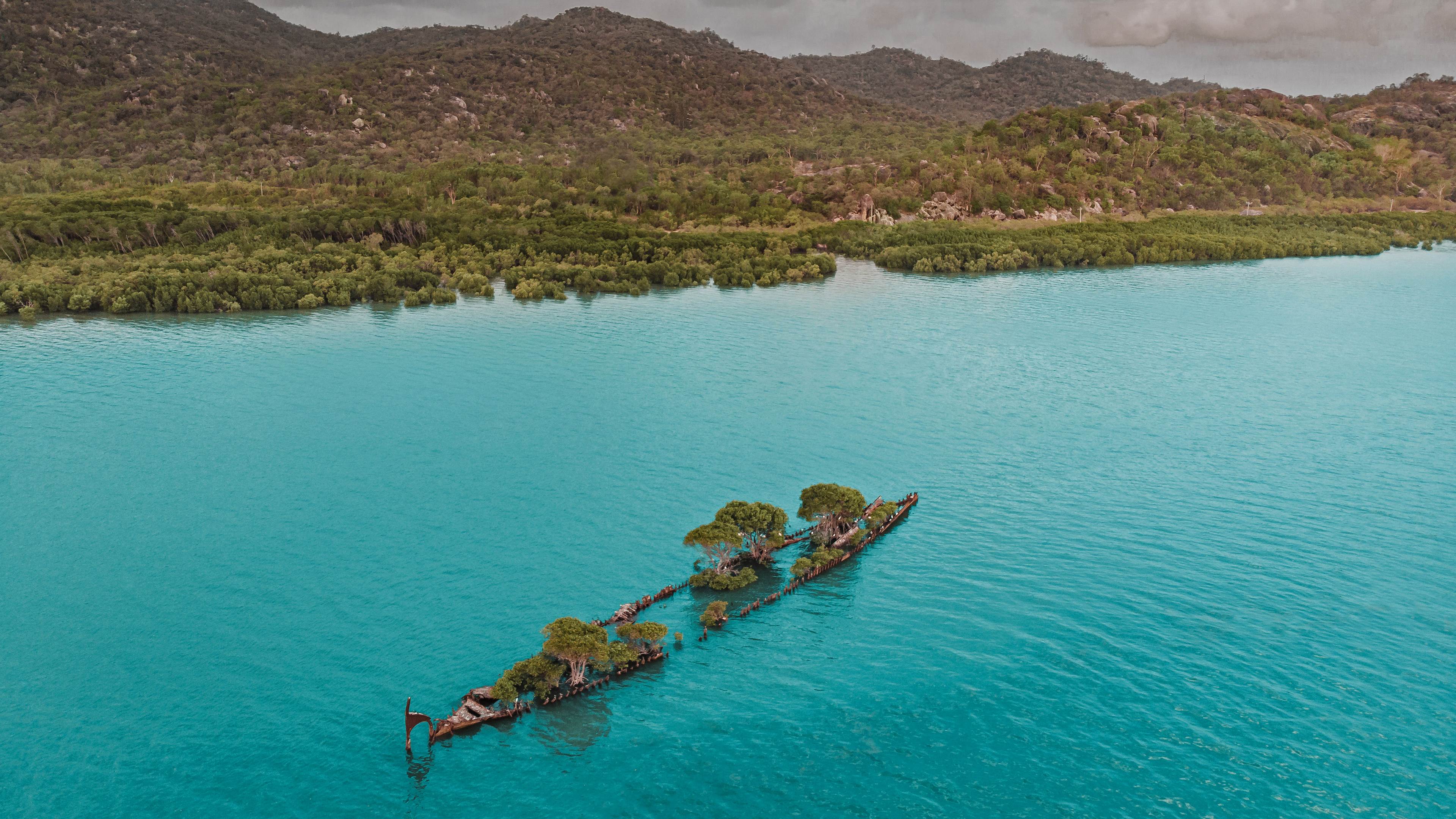 航拍生长着树木的遇难船“阿德莱德市”残骸,澳大利亚磁岛 (© Amazing Aerial Agency/Offset by Shutterstock)