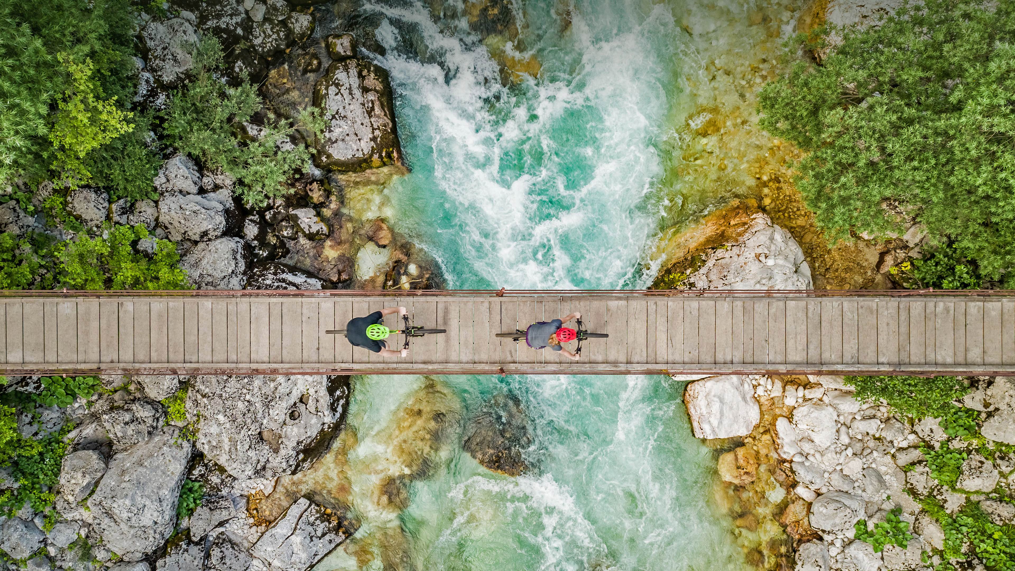斯洛文尼亚索奇河上的木制吊桥上骑自行车的人的鸟瞰图 (© Amazing Aerial Agency/Offset by Shutterstock)