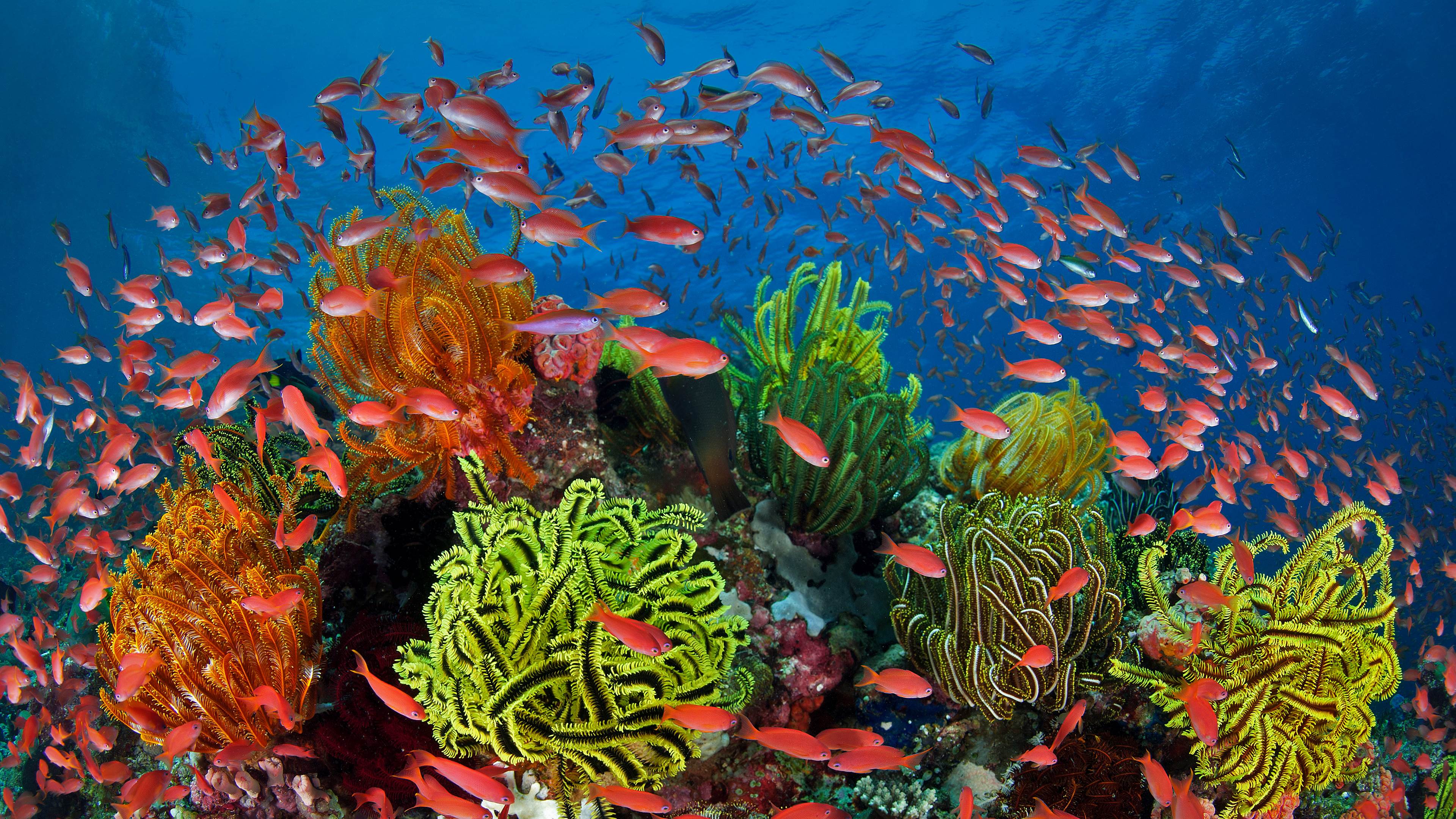 珊瑚礁周围的丝鳍拟花鮨鱼群,澳大利亚昆士兰大堡礁 (© Gary Bell/Minden Pictures)