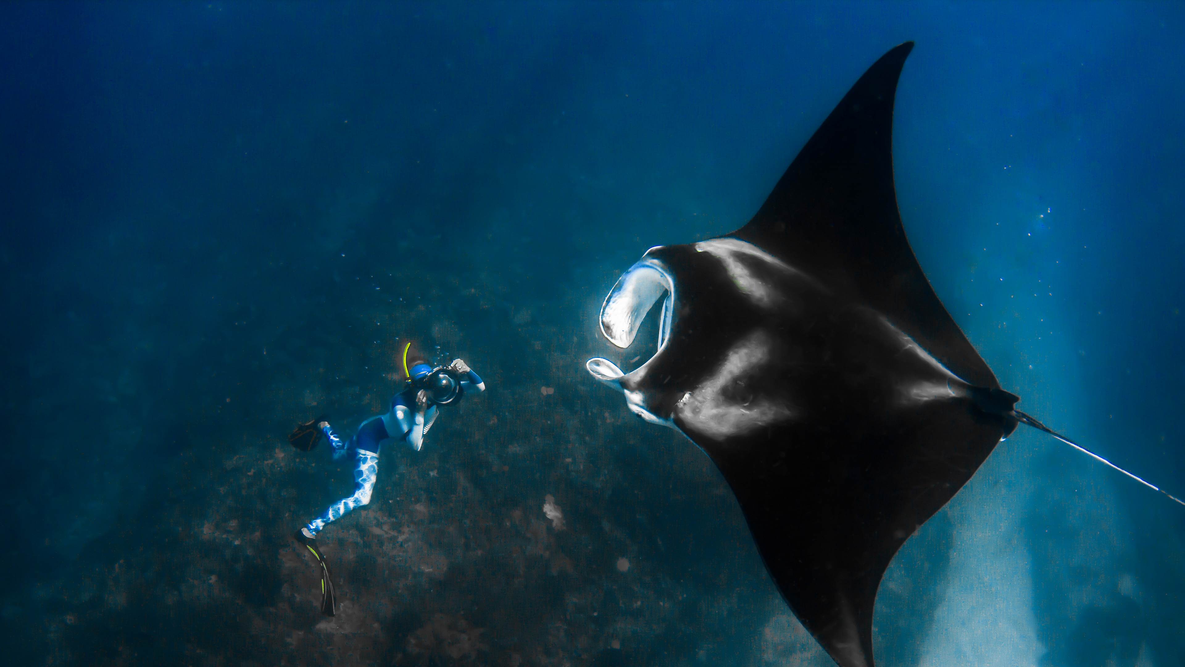 巨型海洋蝠鲼和摄影师,澳大利亚宁格罗海岸 (© Shutterstock Premier)