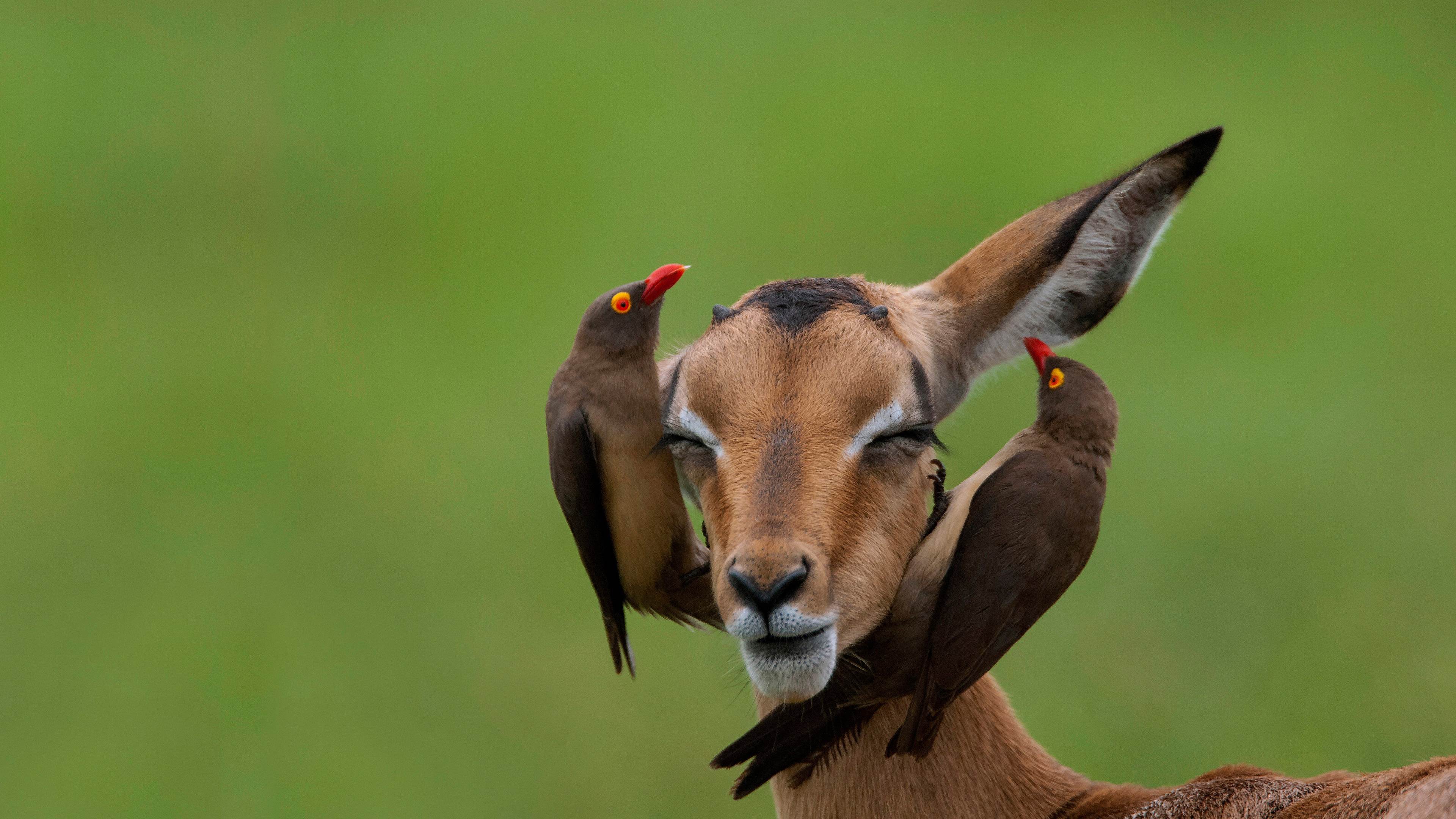 红嘴牛椋鸟和高角羚, 南非姆普马兰加省 (© Heini Wehrle/Minden Pictures)