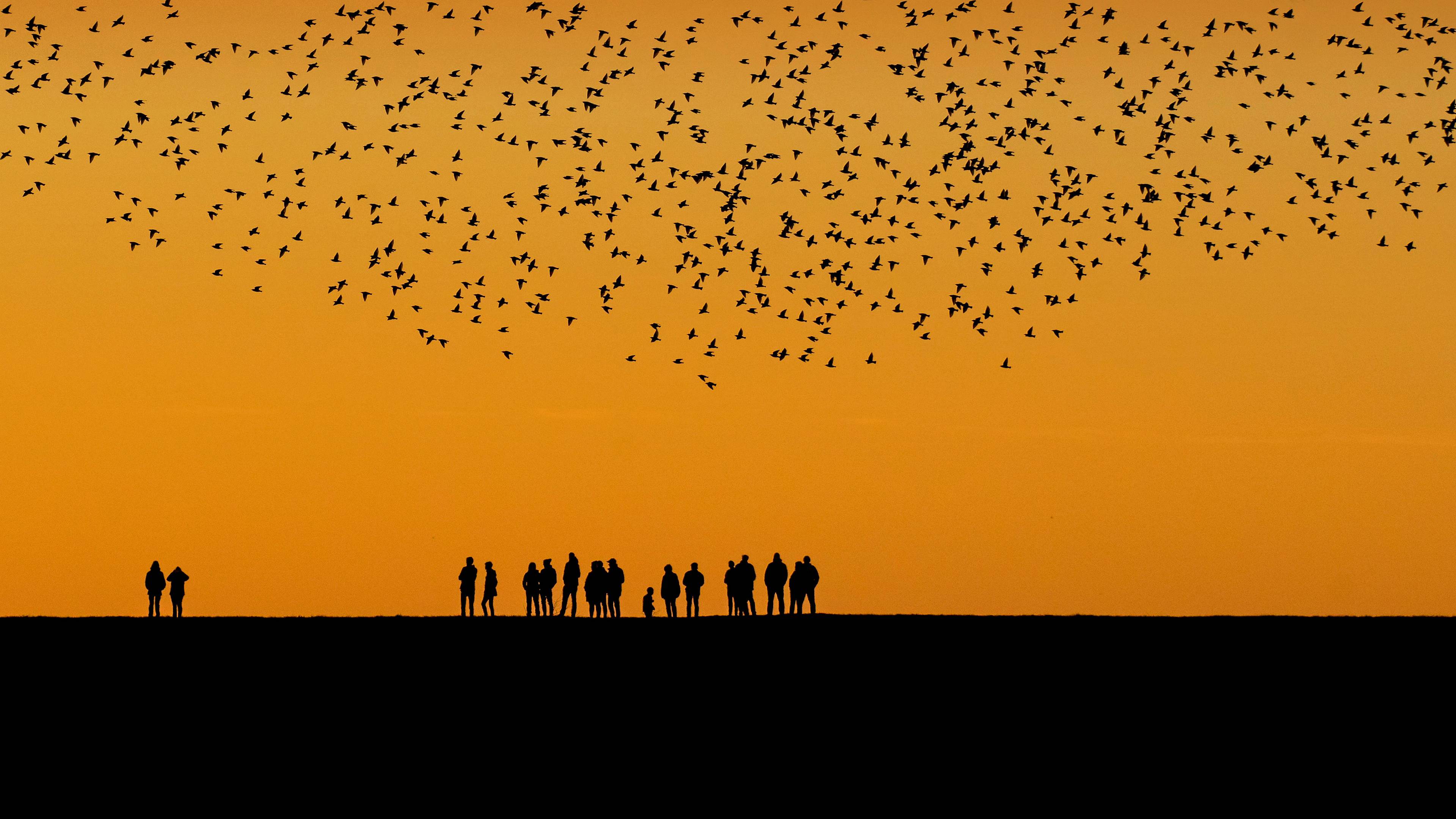 秋季在湿地上空迁徙的椋鸟群 (© Viking/Alamy)