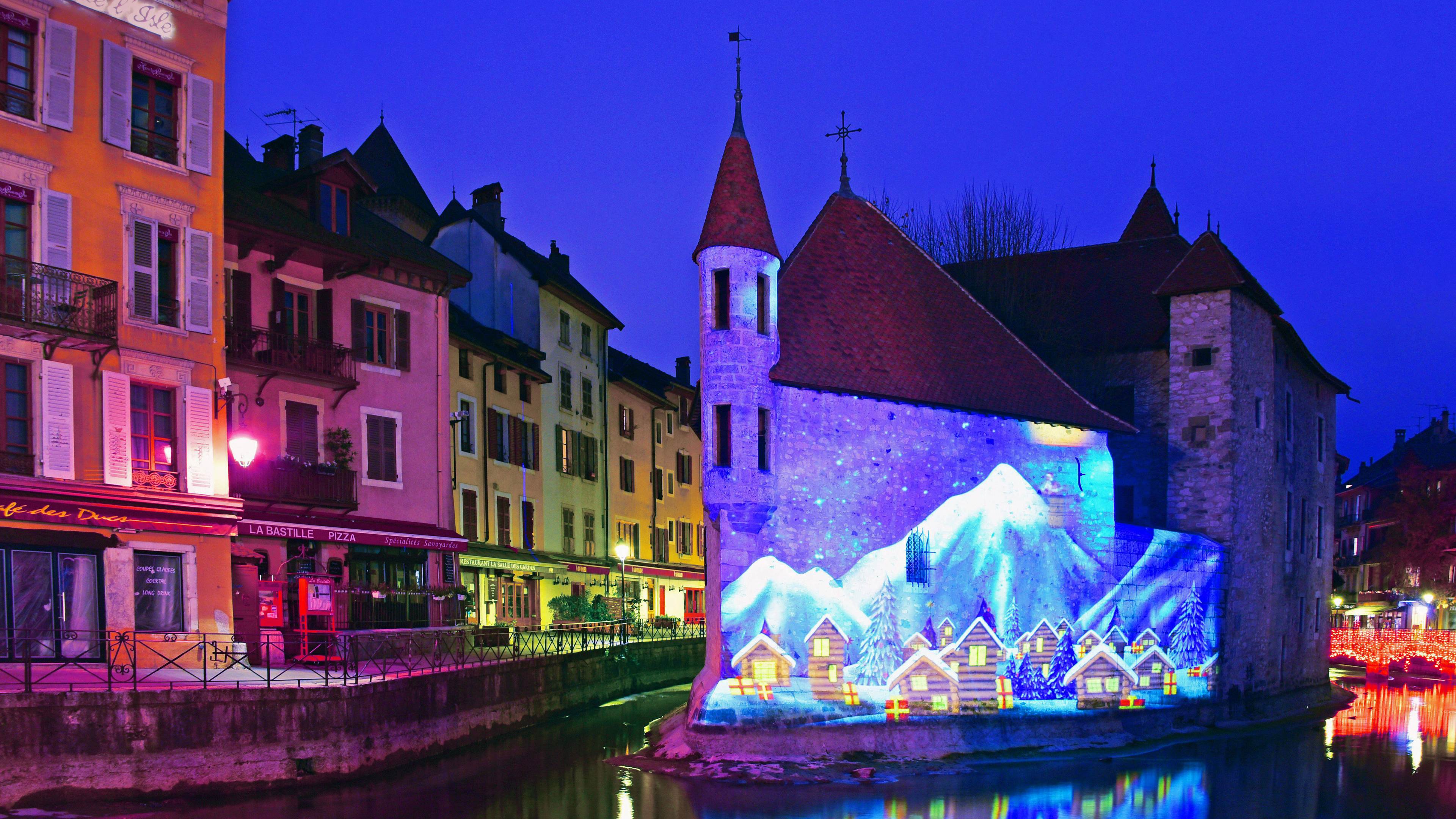 投射在安纳西中皇岛墙上的雪景影像,法国上萨瓦省 (© blickwinkel/Alamy)