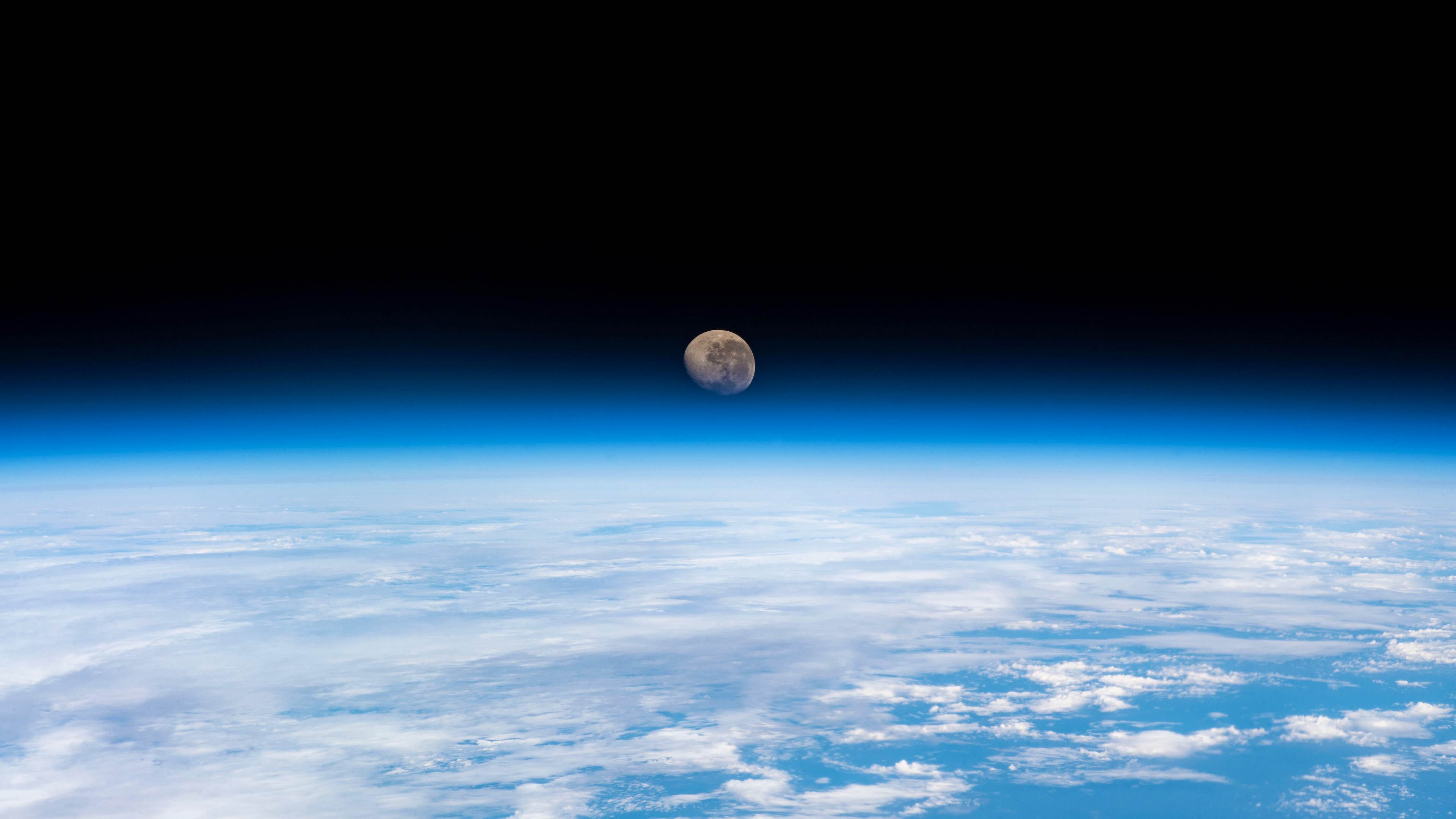 从国际空间站拍摄到的地球上方的渐亏凸月 (© NASA)