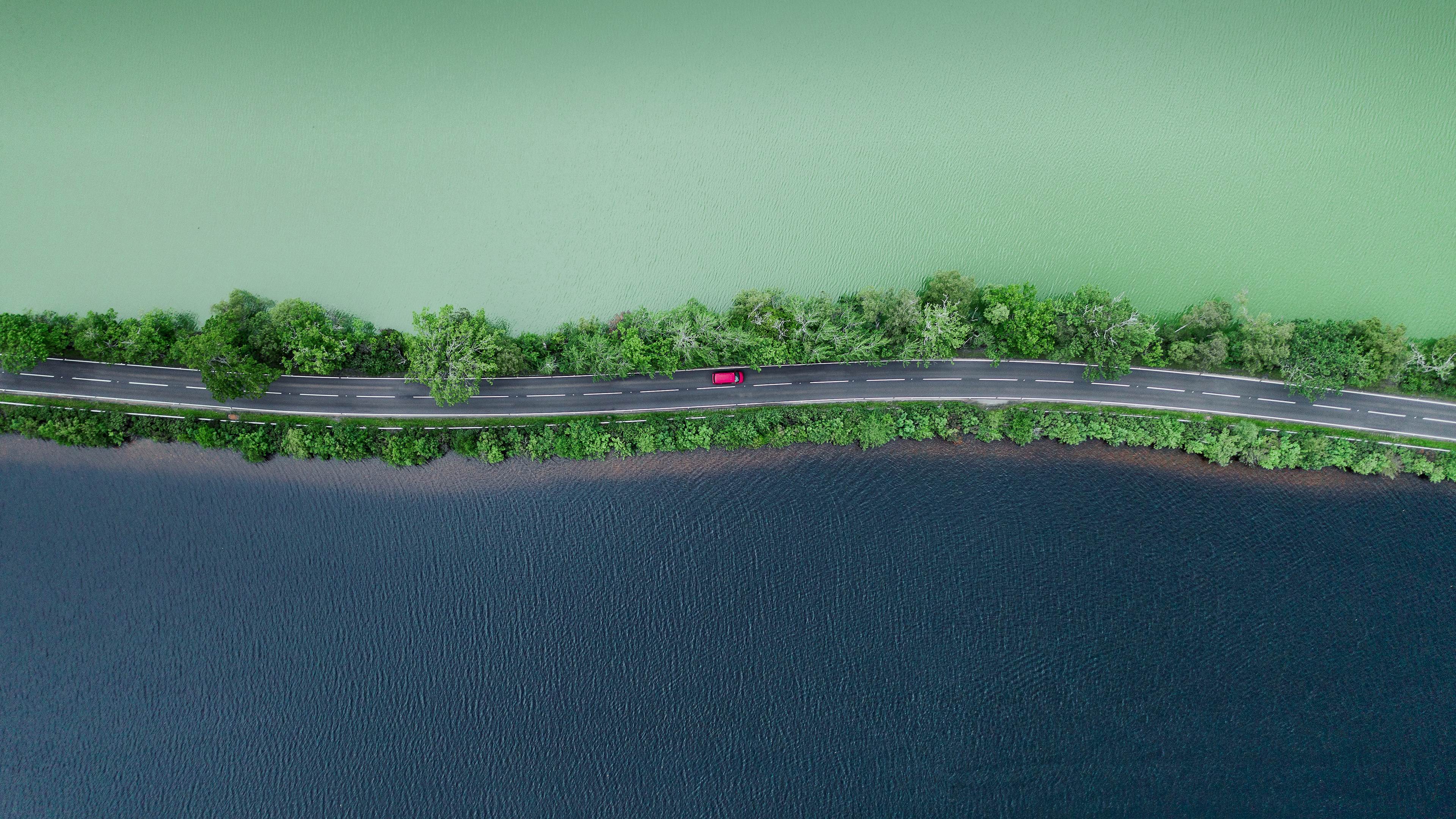 分隔两个湖泊的公路,苏格兰高地 (© Abstract Aerial Art/Getty Images)
