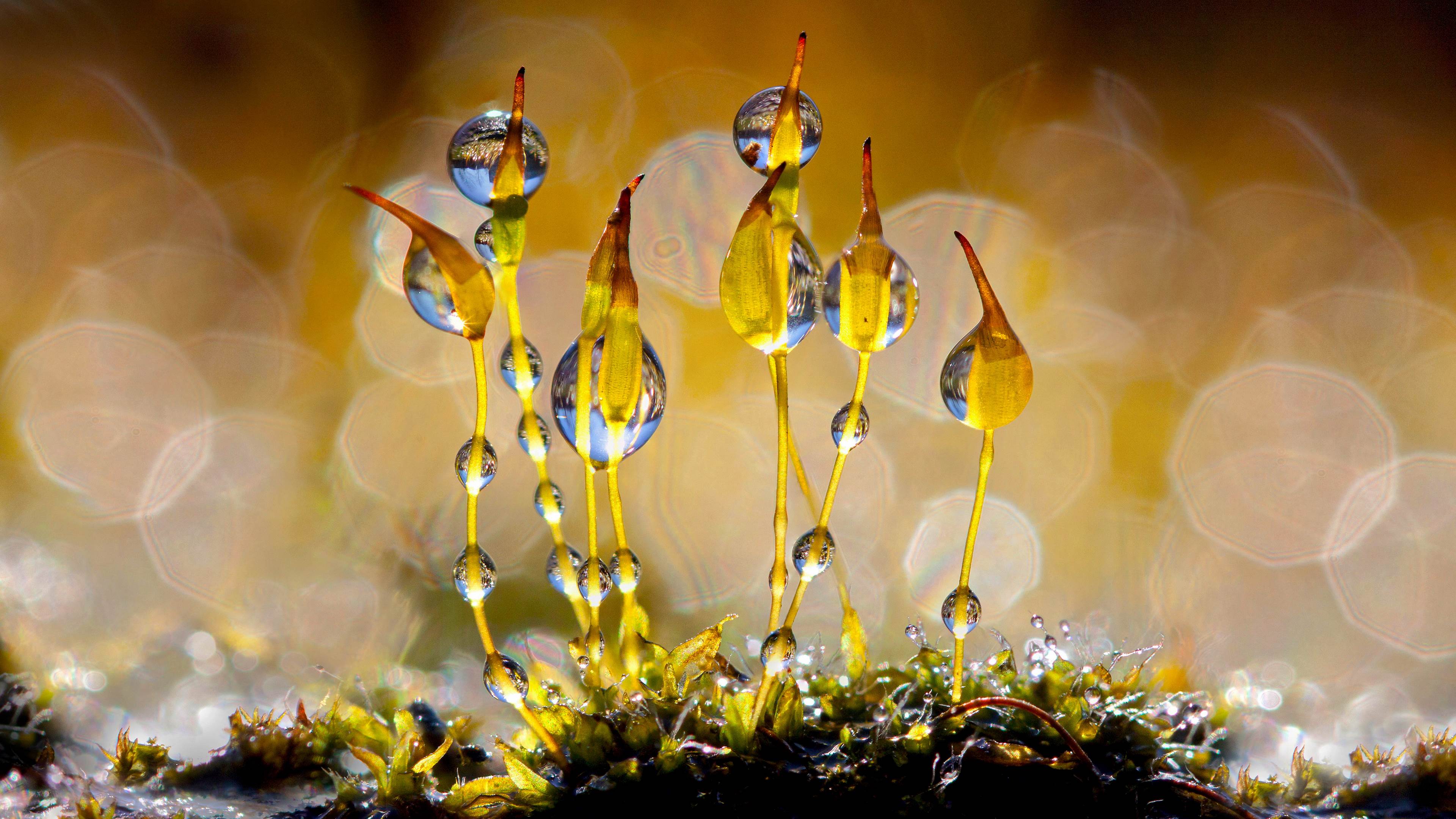你可能会惊讶,这种点缀着水滴的优雅植物是一种苔藓:泛生墙藓,它更常见的名字是墙螺旋苔藓。泛生墙藓遍布全世界,甚至都市里也不乏它们的身影(都市里土壤干燥、空气污染严重,许多敏感的苔藓难以存活)。一般来说,苔藓是空气污染的精确监测器——它们吸收空气和水,所以污染物能够在它们的细胞中被检测出来。<br>泛生墙藓只是15000到25000种苔藓中的一种,这些古老的植物可以追溯到4.5亿年前。这种顽强的植物经受住了数亿年气候变化的考验,能够在冰冷的苔原或炙热的沙漠平原上生存。它们通过整个植物体来吸收水分。这种高效吸水的能力使苔藓成为第一批从森林火灾或极端高温中恢复过来的植物。广泛分布的苔藓还可以稳定土壤,使土壤保持水分。<br>这张照片正好捕捉到了雨滴落在苔藓上的瞬间。这是一个微距摄影的完美例子,当照相机把物体的实际尺寸放大很多倍时,我们更能欣赏到自然界的这种精致之美。