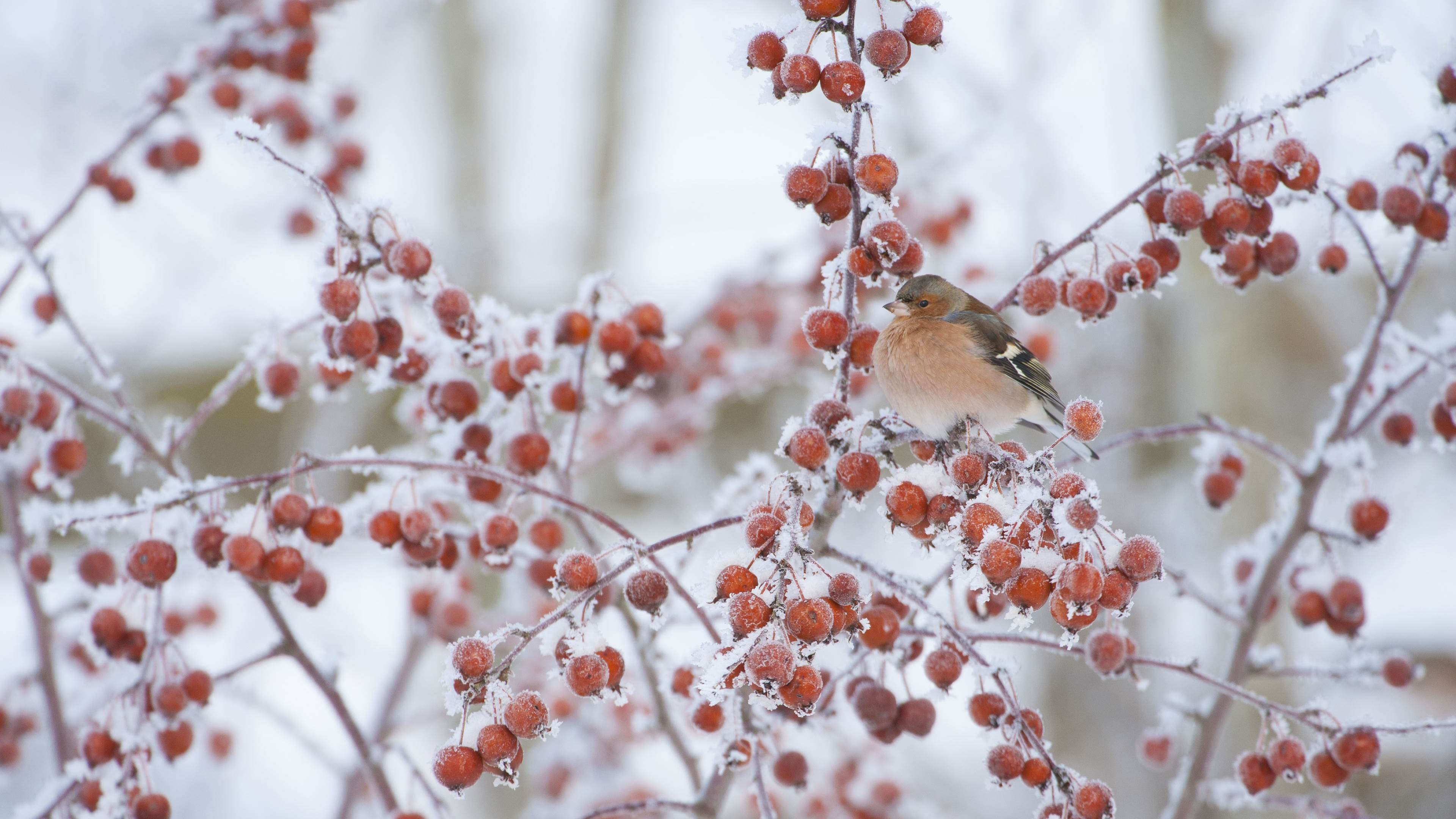 冬天,雄性苍头燕雀栖息在海棠果树上 (© Mark Hamblin/2020VISION/Minden Pictures)