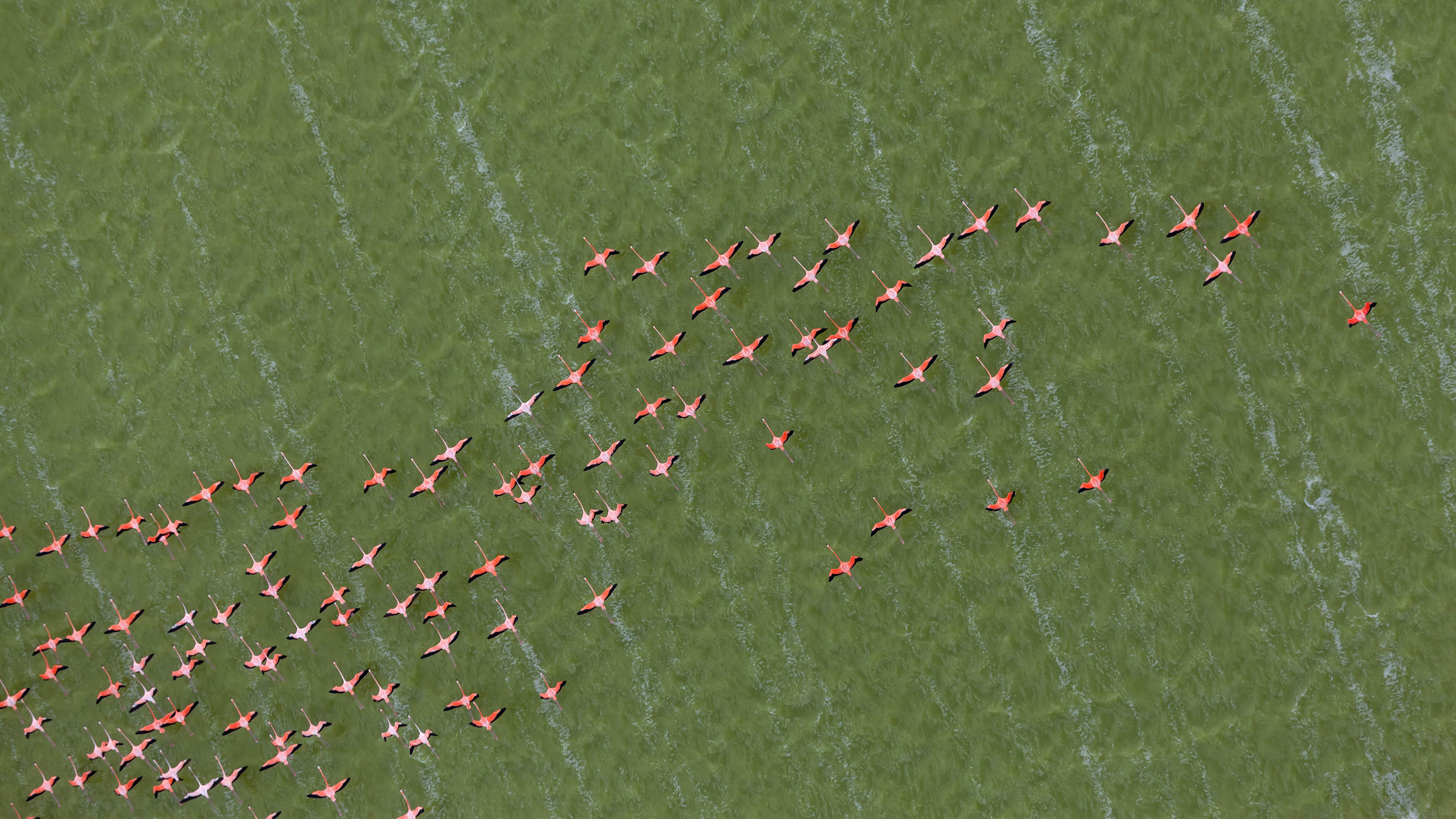 你见过一群火烈鸟飞上天空吗?如果你见过,它们很有可能就是加勒比火烈鸟,也叫美洲火烈鸟,就像今天图片中在墨西哥尤卡坦半岛看到的那样。火烈鸟成群出没时被称为“火烈鸟群”,但它们也可以被称为“站群”或“群落”。加勒比火烈鸟是美洲最大的火烈鸟物种,也是唯一原产于北美的物种。这些充满活力的鸟类通常栖息在咸淡水和海水地区,如沼泽、河口和海岸线一带。由于其通体粉红色,它们经常被误认作粉红琵鹭。不过,长长的脖子和弯曲的喙将它们与大蓝鹭和木鹳等涉水鸟类区分开来。<br>加勒比火烈鸟分布在美国东南部、南美洲北部、加拉帕戈斯群岛和墨西哥尤卡坦半岛等地区,非常适合短途迁徙觅食。它们用长腿和有蹼的脚在浅水区捕食虾、甲壳类动物、软体动物、鱼类和藻类。它们的栖息地日益受到沿海开发、污染和海平面上升的威胁,使得种群处于危险之中。然而,当加勒比火烈鸟在天空中优雅地翱翔时,仍会让世人惊叹不已。